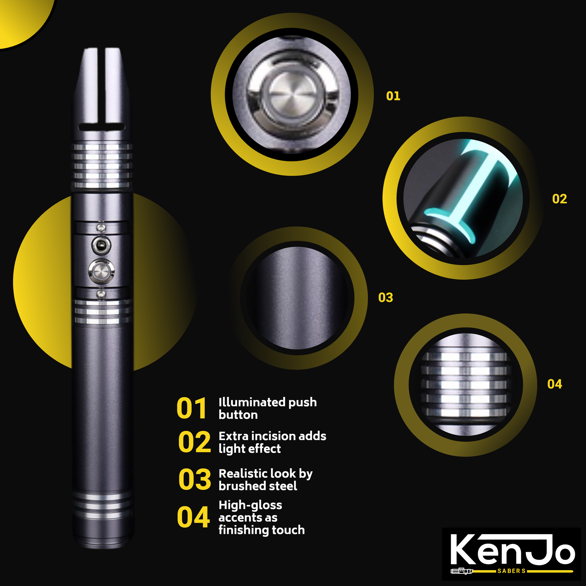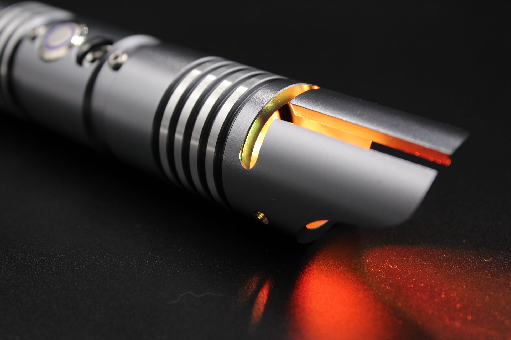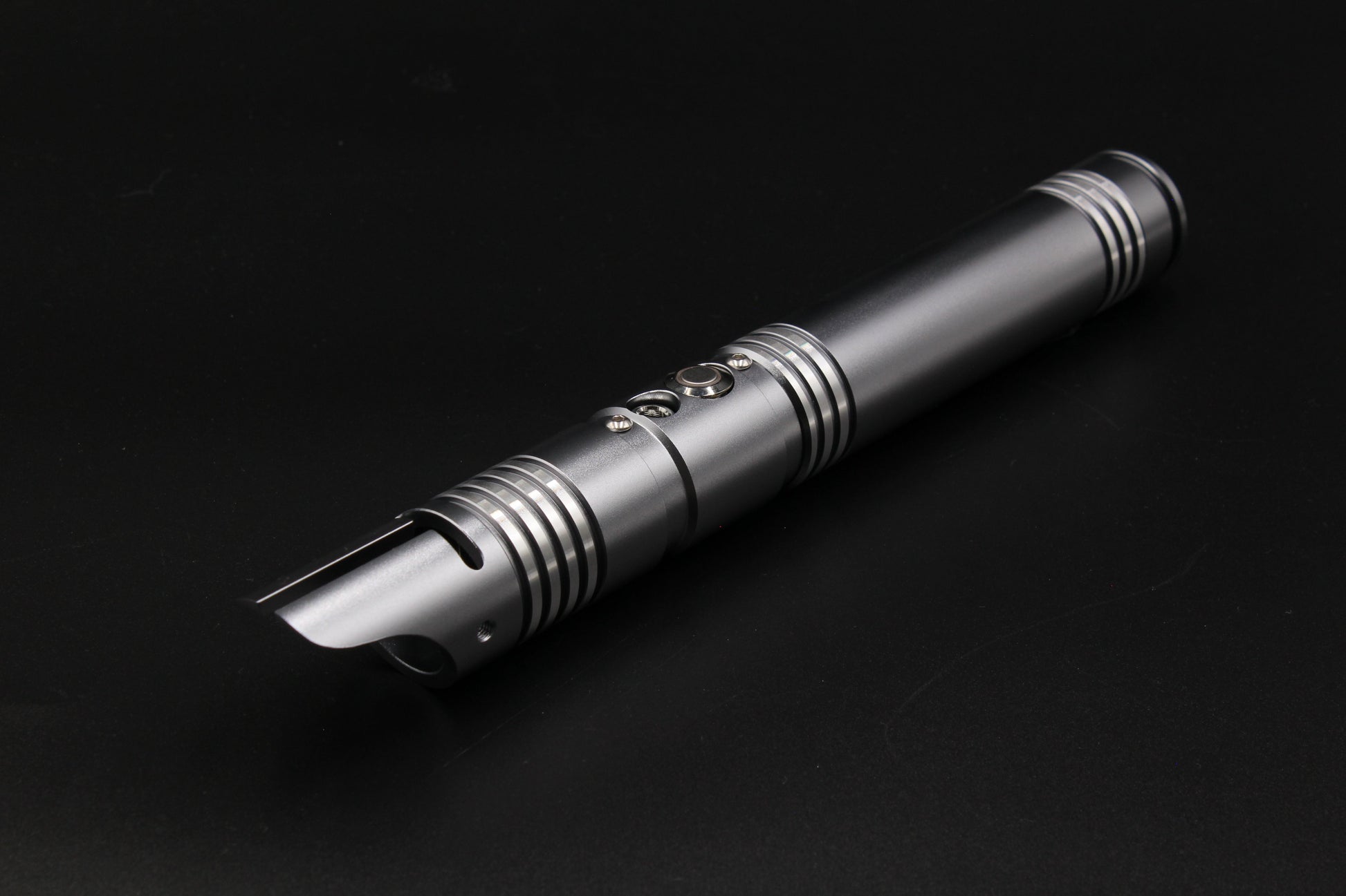The Dawnbreaker lightsaber has a hilt made from a matte dark gray aluminum alloy with silver details. This construction makes the hilt lightweight yet durable. The smooth grip provides a comfortable hold, and the cut-out at the top of the hilt creates an additional light effect, giving a subtle nod to "The Mandalorian" series.