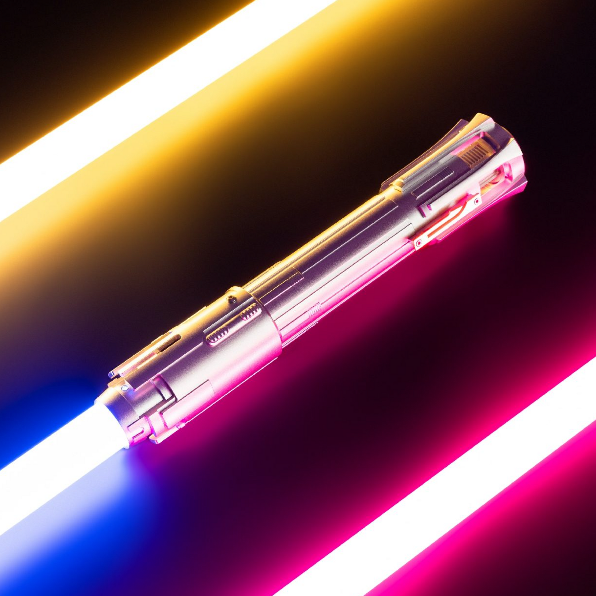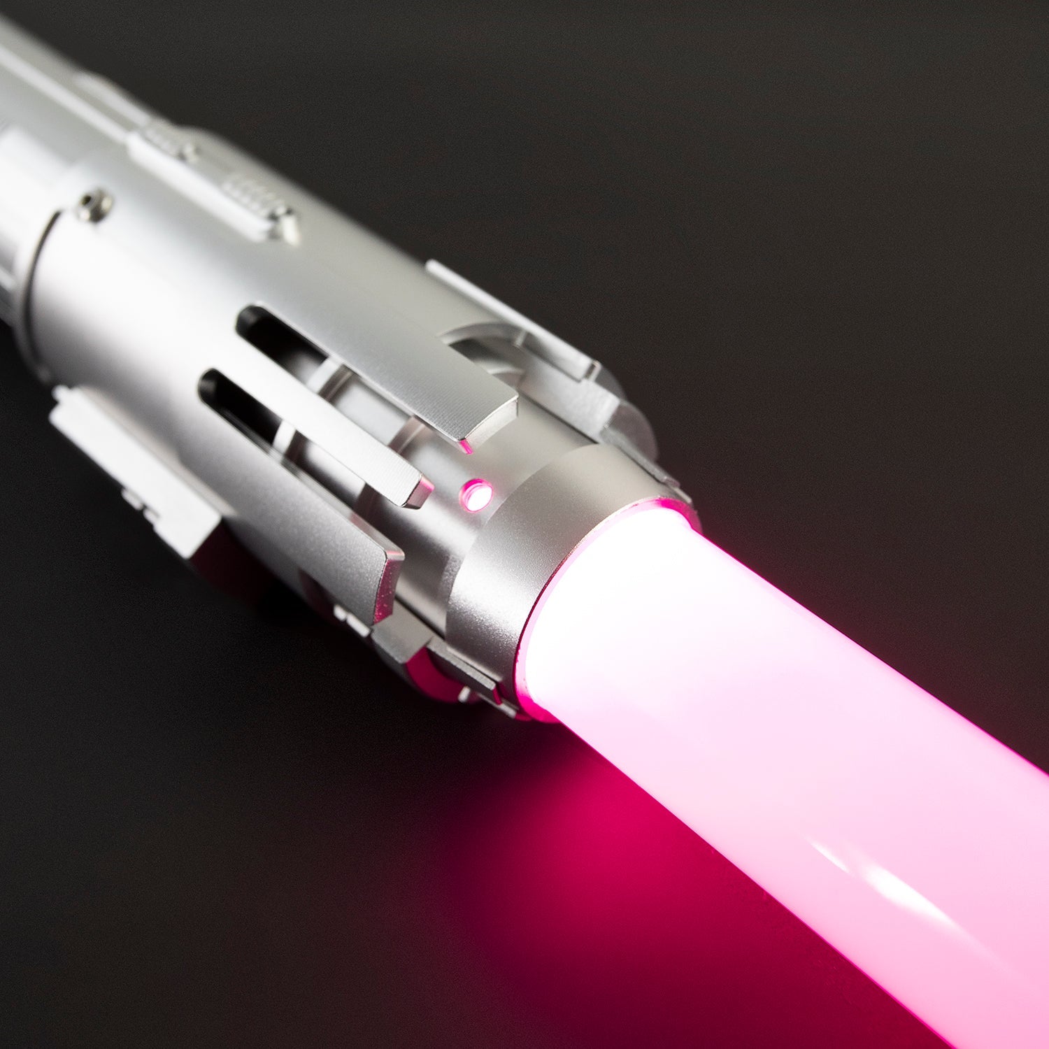 The Descendant is a highly detailed and unique saber. It features a matte silver finish with various intricate details and plating. The top and bottom of the saber have open sections, revealing parts of the underlying matte silver interior. The saber’s grip is round and smooth, making it comfortable to hold and easy to spin.