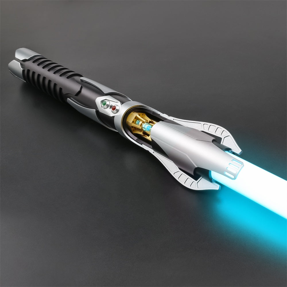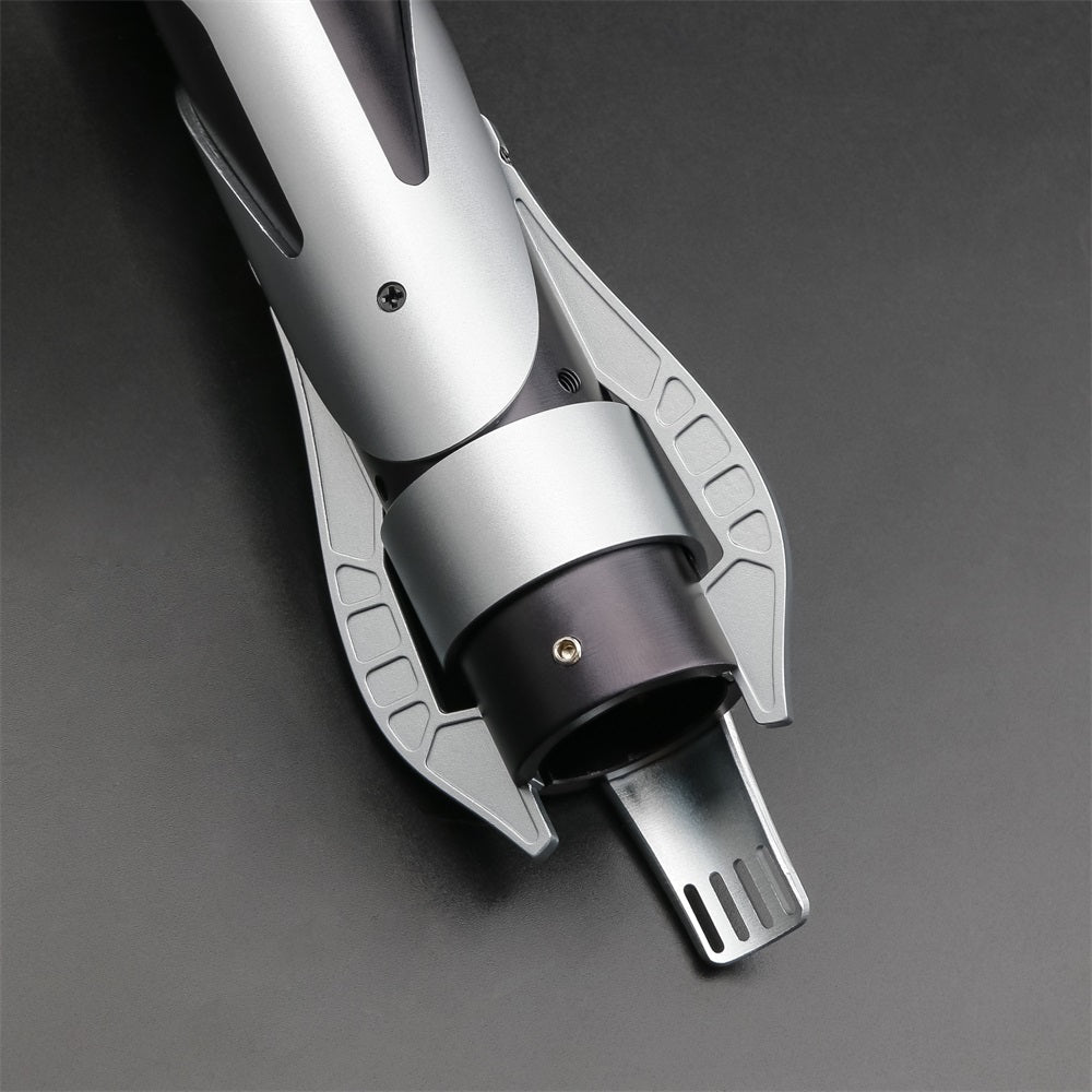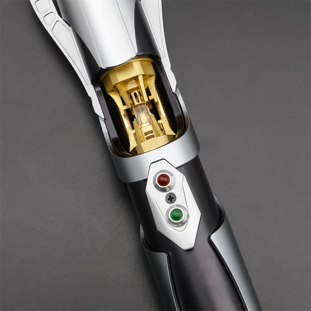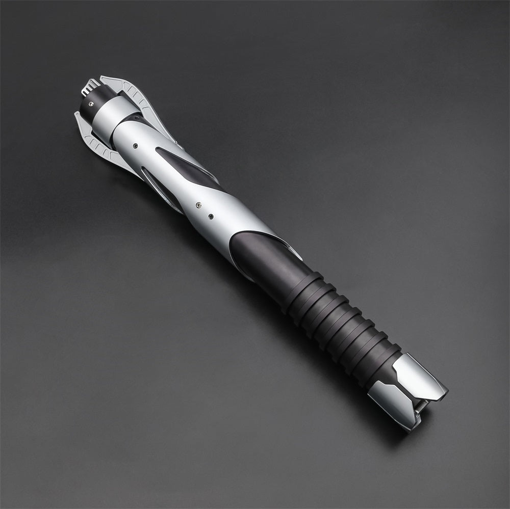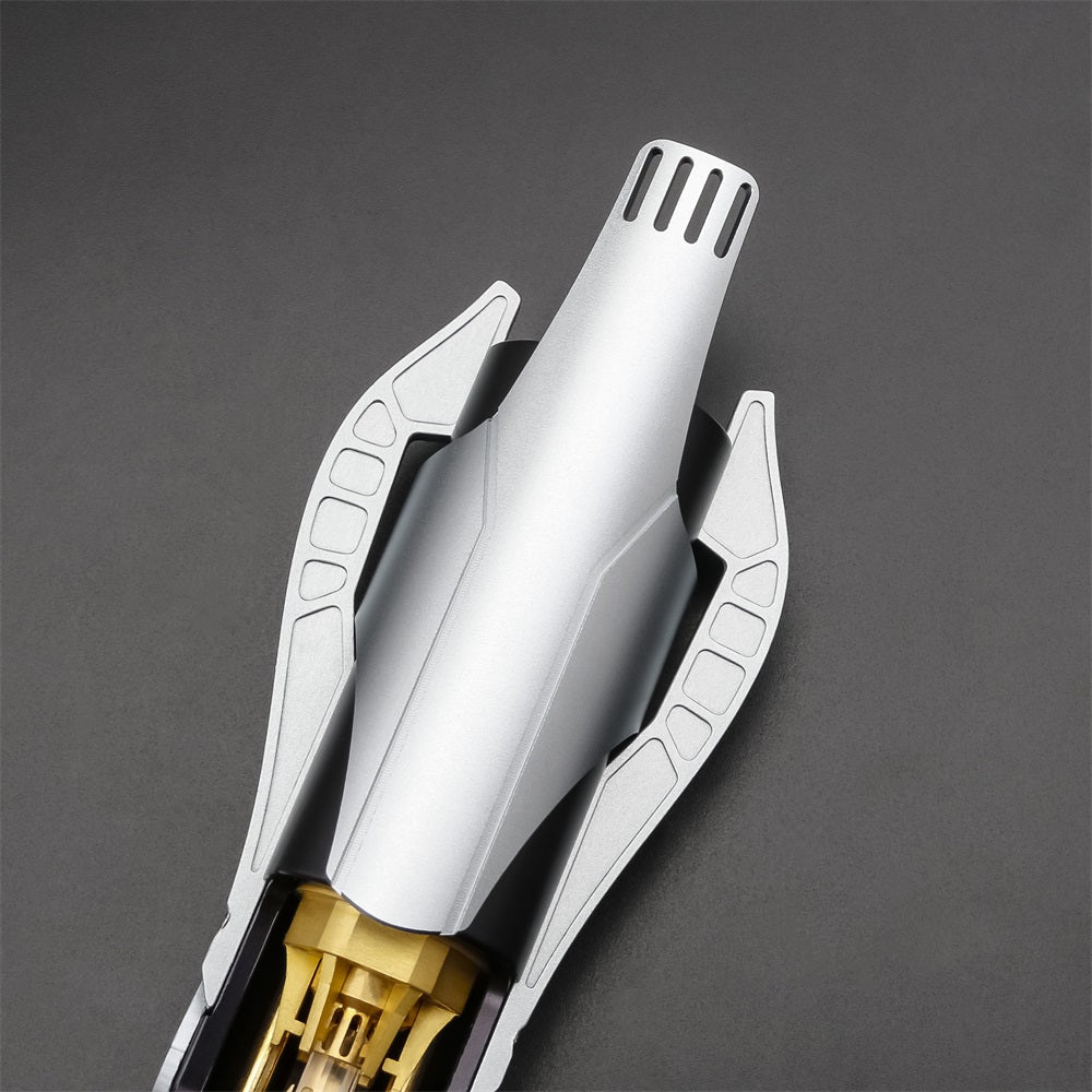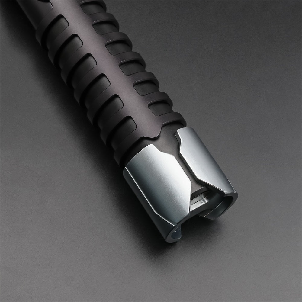 The Grey Griever is a sleek and bold-looking saber, primarily black with gray accents. The hilt is entirely black, featuring various horizontal, coarse grooves for a firm grip. The saber is operated using two buttons. Just above them is perhaps the most striking feature: the exposed kyber crystal, which changes color along with the blade. The emitter is designed with a combination of horizontal and vertical plating, subtly referencing the almost namesake character.