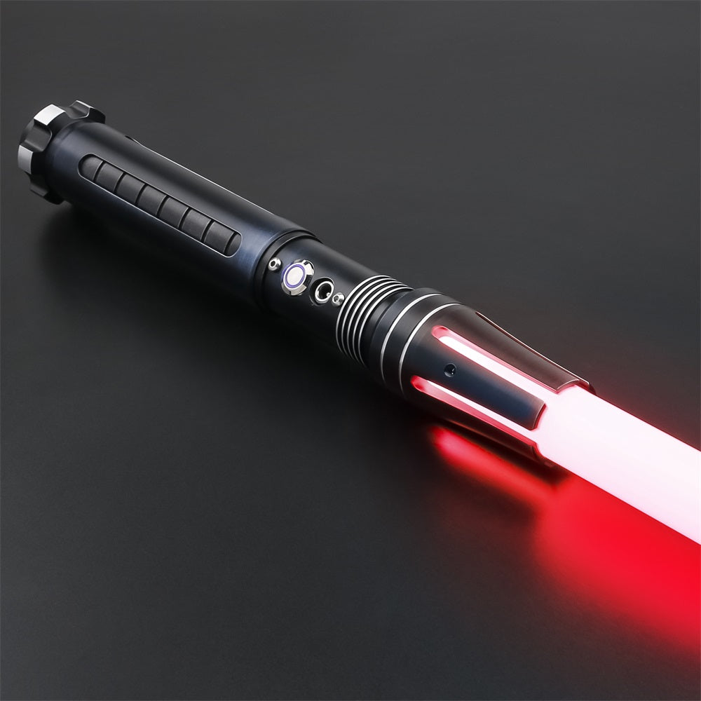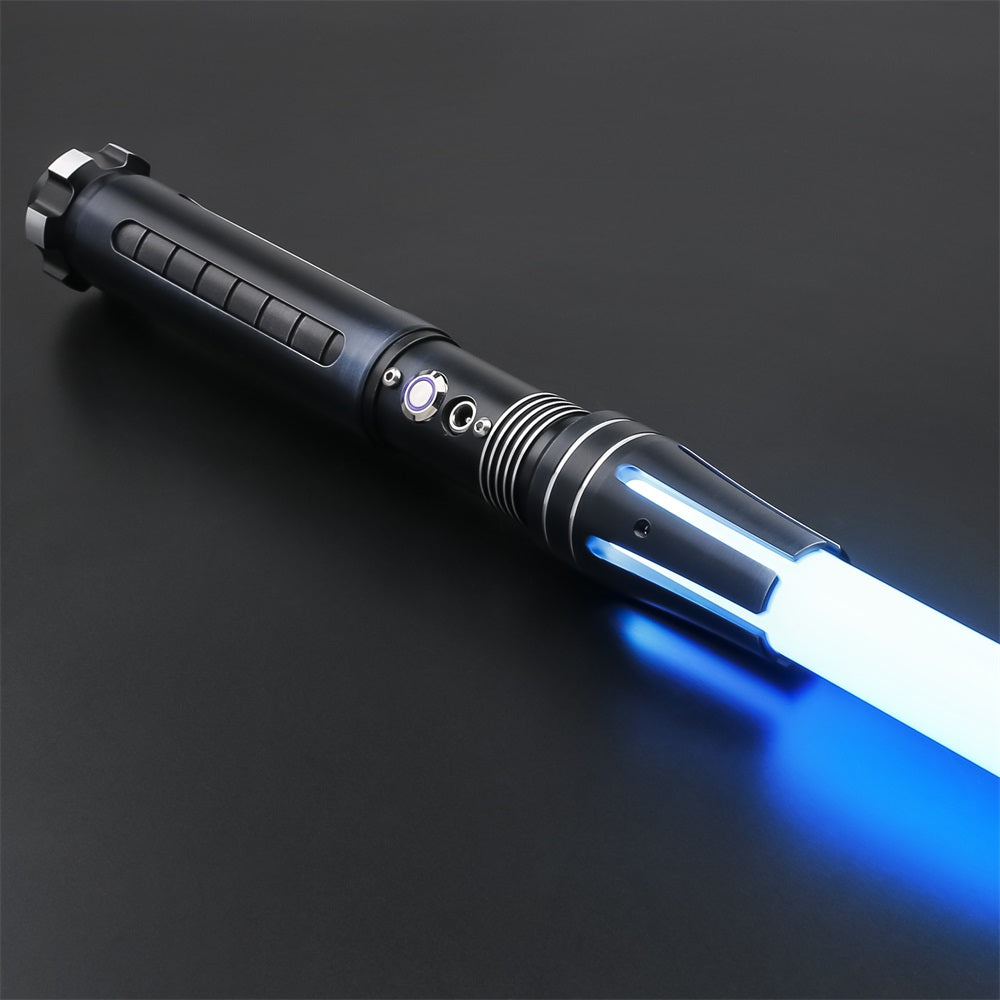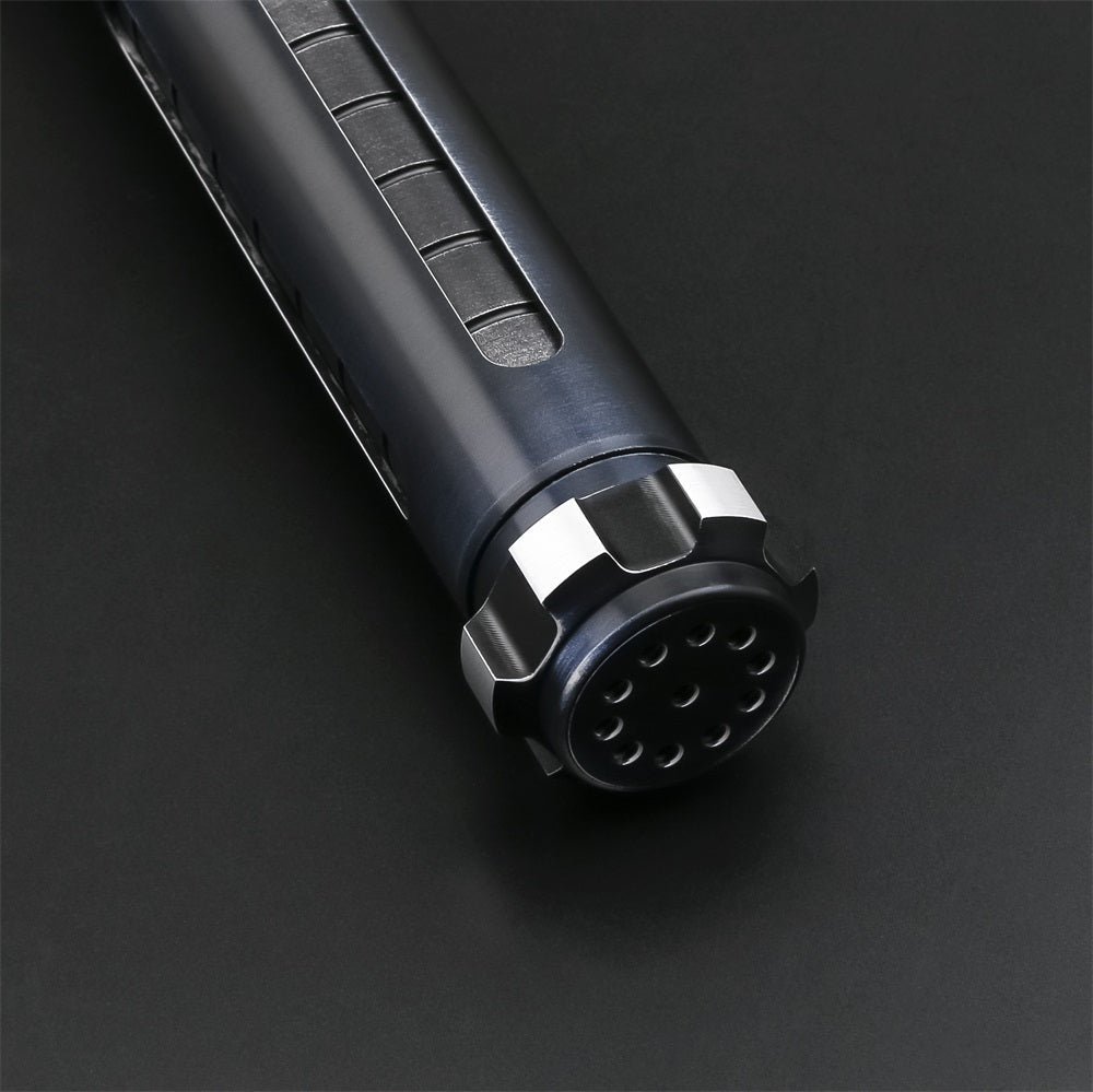 The handle of the Guardian lightsaber is made from a matte silver-colored aluminum alloy. The saber features additional cutouts on the sleeve, giving the Guardian a rugged and high-quality appearance. These cutouts also provide extra grip. The top of this saber is equipped with an emitter featuring cutouts, which adds extra light effects. This emitter ensures that the blade stays securely in place, which is why this saber deserves a spot in the "Heavy Duty" category. The bottom of the Guardian is fitted with a solid round pommel with notches. This allows you to place the saber upright easily and securely. A major advantage of the Guardian is that the handle is made from a single piece, and the blade fits relatively deep into the handle. This design ensures that the Guardian is durable enough for dueling.