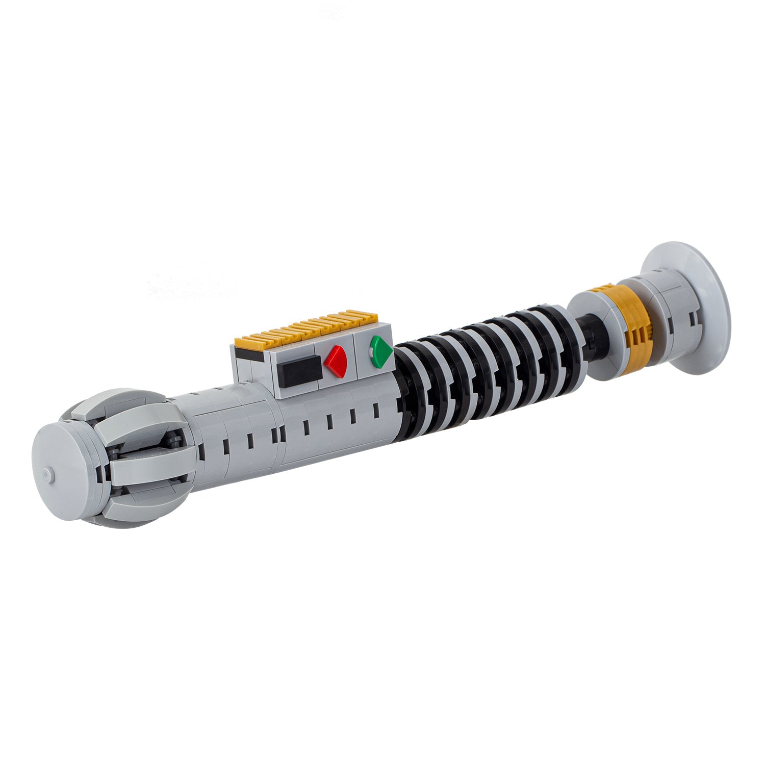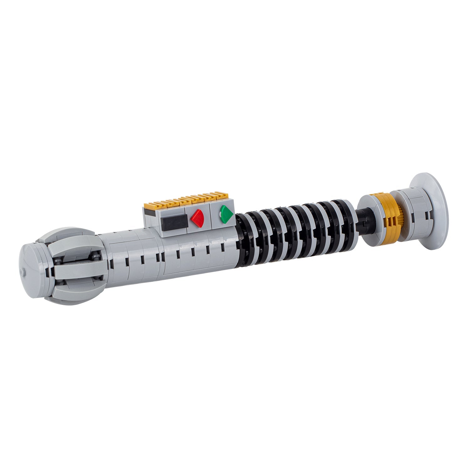 The Icon Super Bricks is a unique, striking saber, primarily gray/silver with distinctive black accents. The grip features bold black ribbed plating, while the narrow neck serves as an immediately recognizable element that emphasizes the grandeur of this lightsaber. The raised switch or control panel stands out clearly.