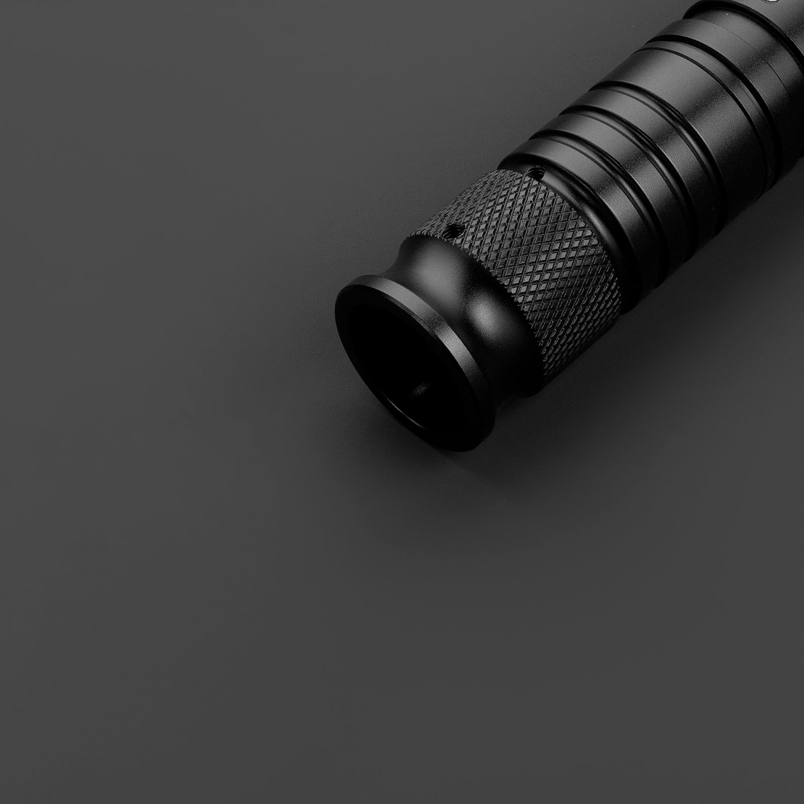 Description: Initiator is a matte black saber made from aluminum alloy. This ensures that the handle is lightweight yet very strong. The top of the emitter is tapered, making it easy to hold at the end of the saber for dueling. The ribbed pattern just below provides an extra firm grip. The blade fitting is deeply seated in the handle, making it very securely attached. The handle itself has finger-shaped notches, making it very comfortable and stable to hold and control during a duel or spinning.