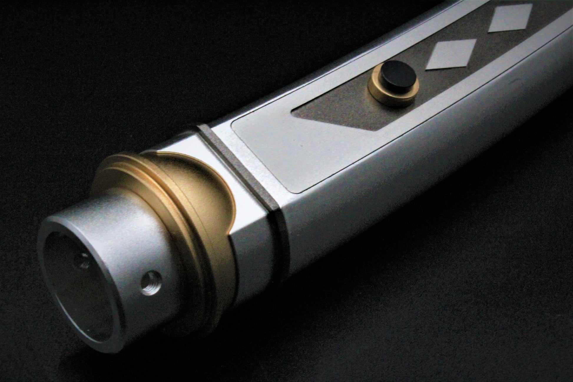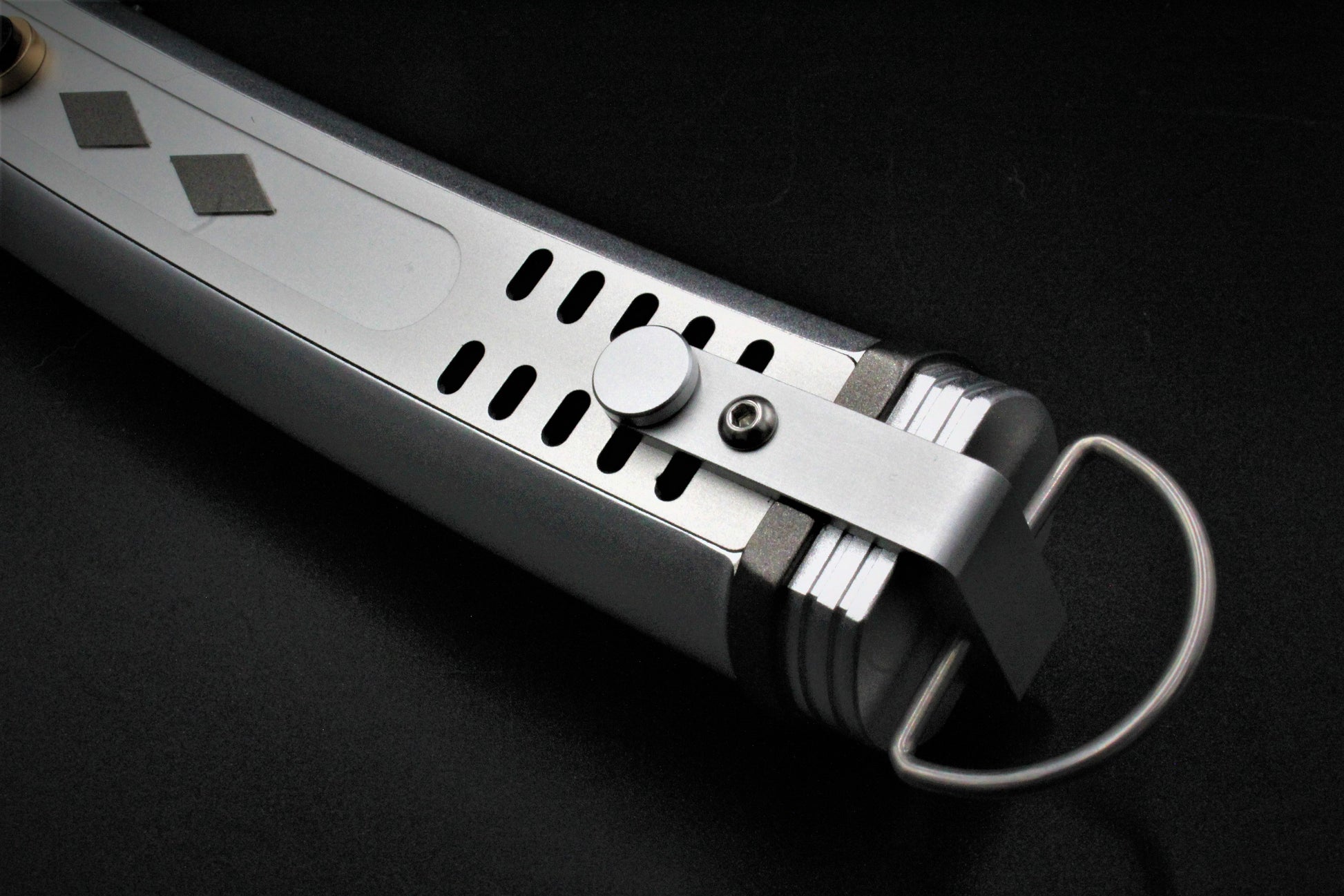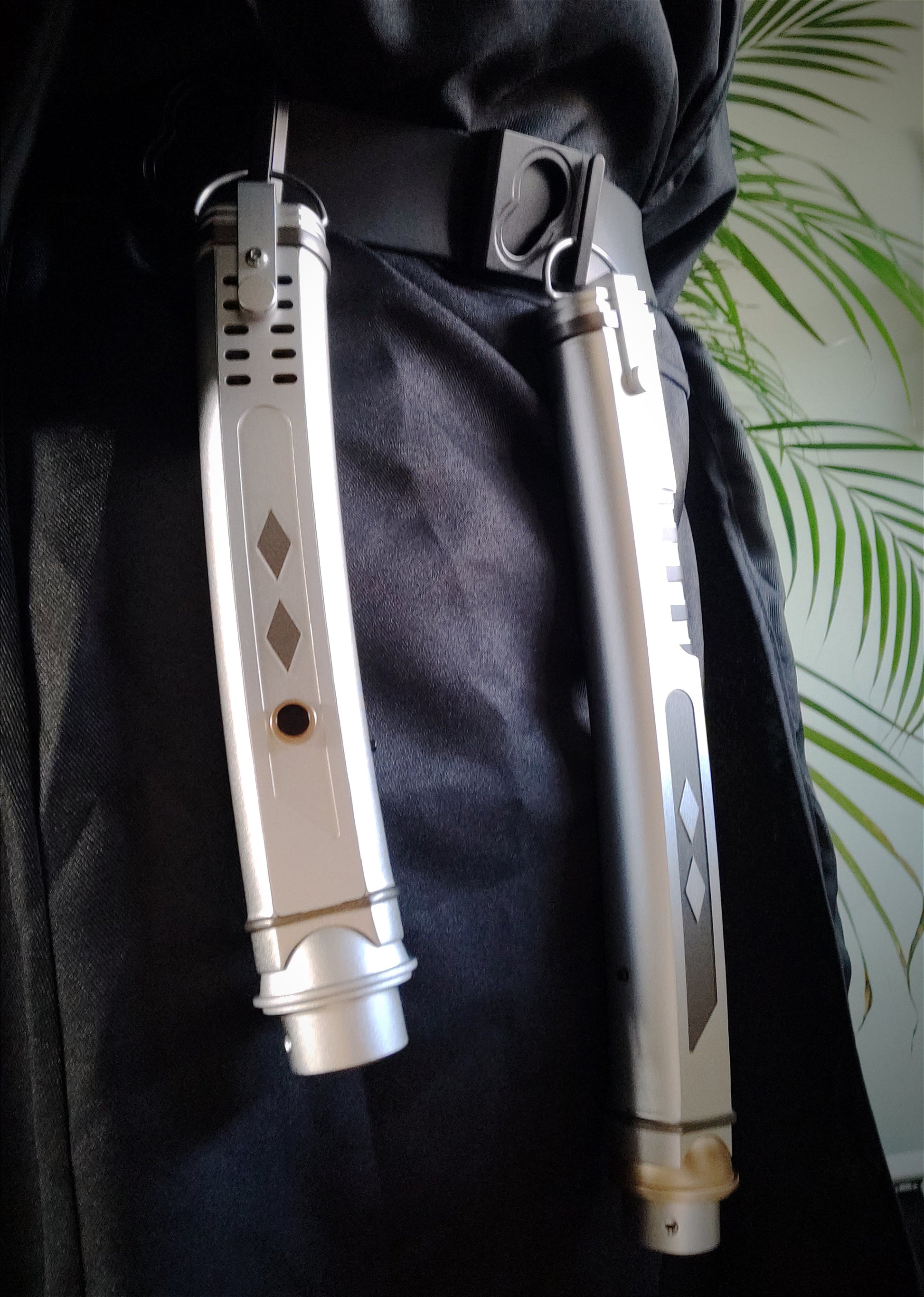 Katano consists of two hilts, a long one and a short one. Both hilts are subtly curved like a classic katana, symbolizing the growth and stability these sabers represent. Unlike the classic saber, this hilt is flat instead of round. The grip features the signature diamond details. The smaller hilt is worn shoto-style in the non-dominant hand. Additionally, the charging port is hidden, and the saber is charged with the included battery charger. The bottom is equipped with a D-Clip ring, allowing you to hang the saber on your belt. For this, you’ll need the Prime Spheres Sabers Belt Clip.