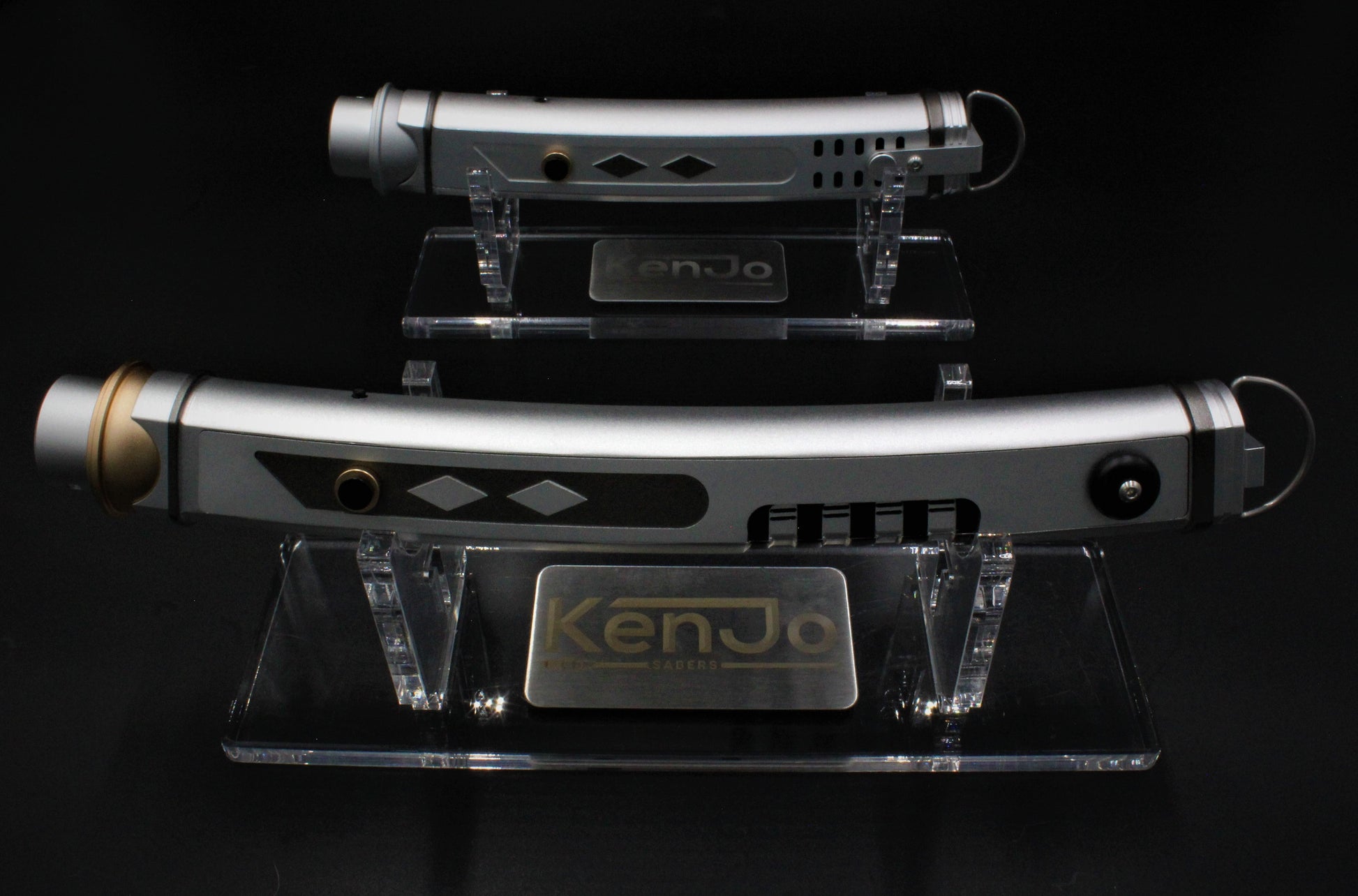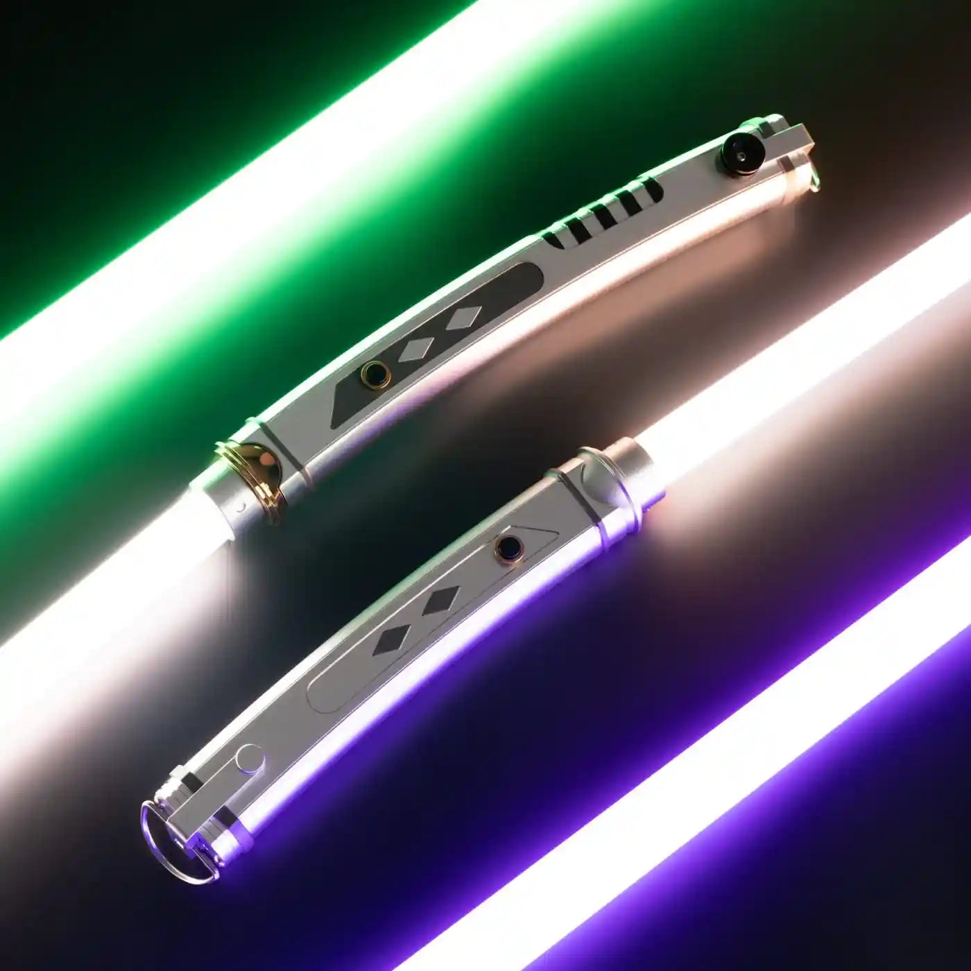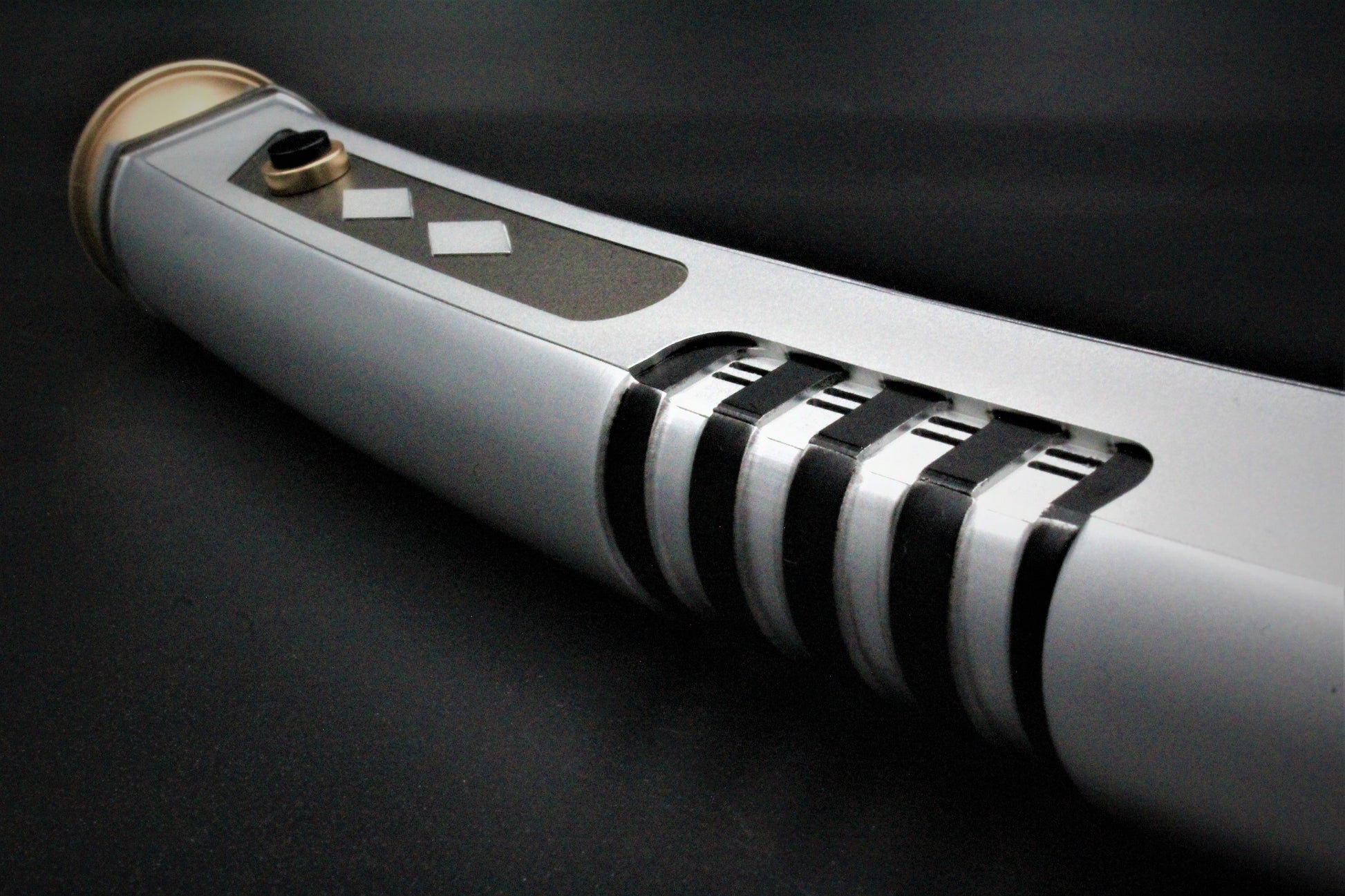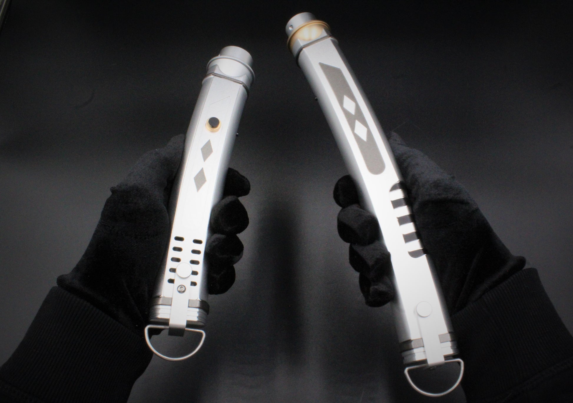 Katano consists of two hilts, a long one and a short one. Both hilts are subtly curved like a classic katana, symbolizing the growth and stability these sabers represent. Unlike the classic saber, this hilt is flat instead of round. The grip features the signature diamond details. The smaller hilt is worn shoto-style in the non-dominant hand. Additionally, the charging port is hidden, and the saber is charged with the included battery charger. The bottom is equipped with a D-Clip ring, allowing you to hang the saber on your belt. For this, you’ll need the Prime Spheres Sabers Belt Clip.