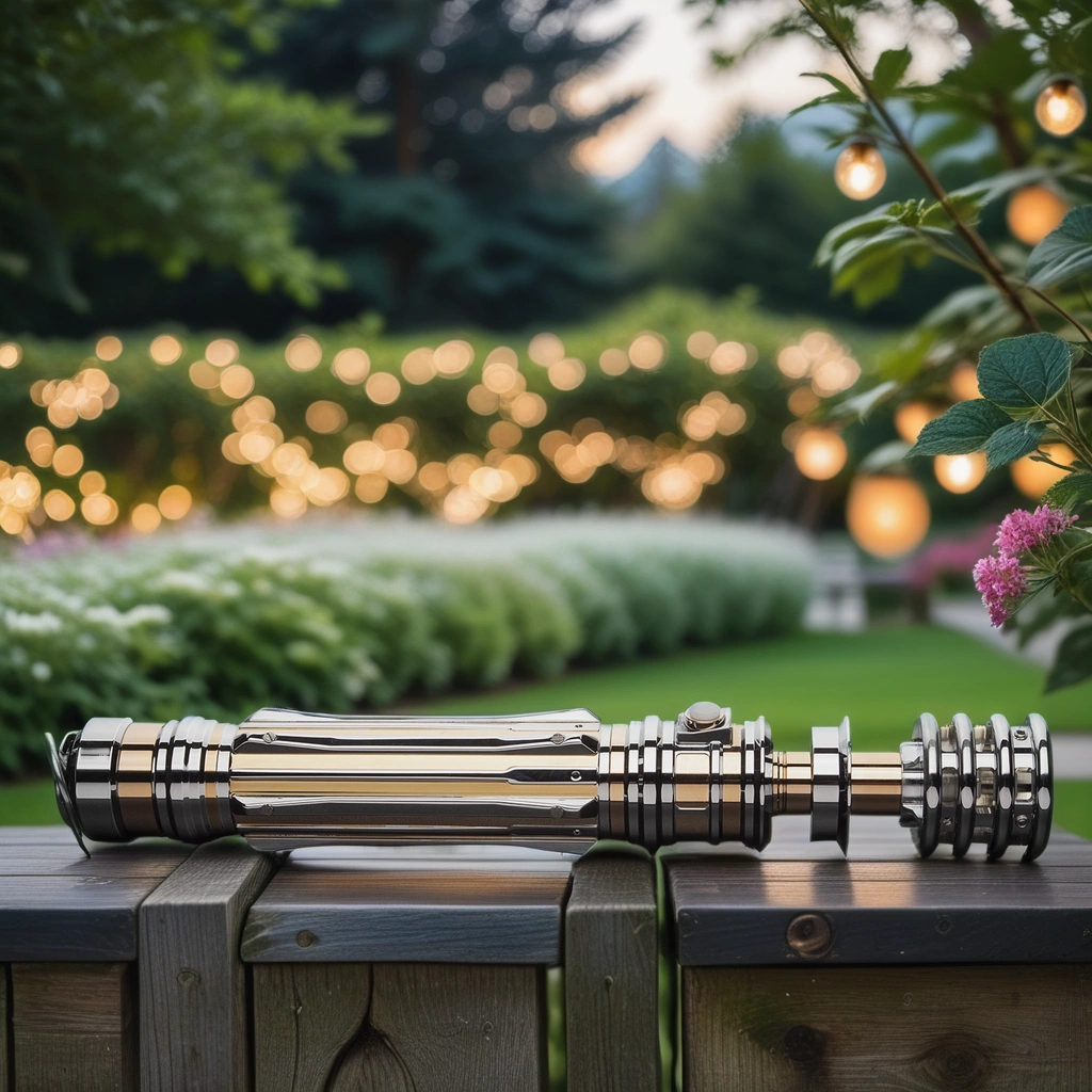 Pearl is a very strong and striking saber, primarily featuring a pink/orange hue adorned with silver-colored inlays. The grip is enhanced with distinctive colored plating, providing an exceptionally firm hold. The control button is custom-made for this saber, slightly tilted forward, and matches the saber’s color perfectly! Additionally, the charging port is neatly concealed, and the saber is powered using the included battery charger.