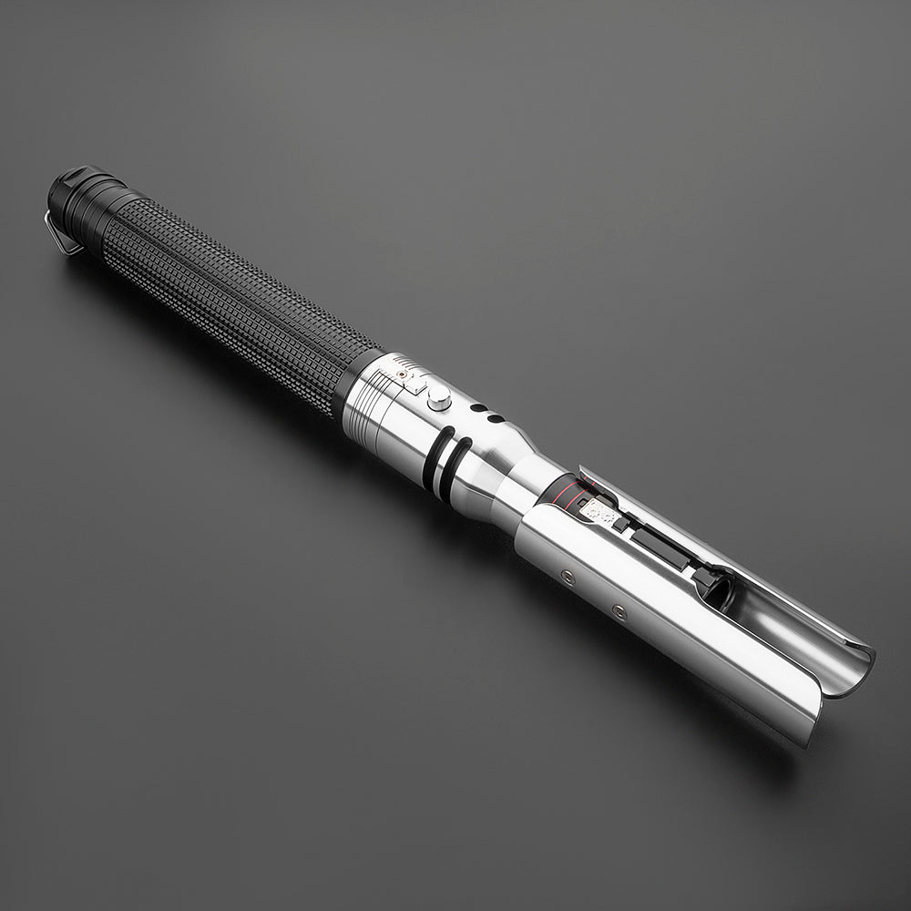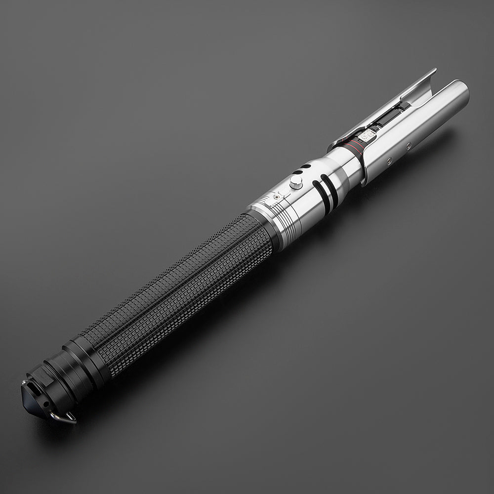 The upper part (emitter) of The Phoenix features two distinctive elongated plates. The lower part of The Phoenix, where the speaker is also located, has a clean finish with a convenient D-Clip, allowing the saber to be attached to a belt using a belt clip.