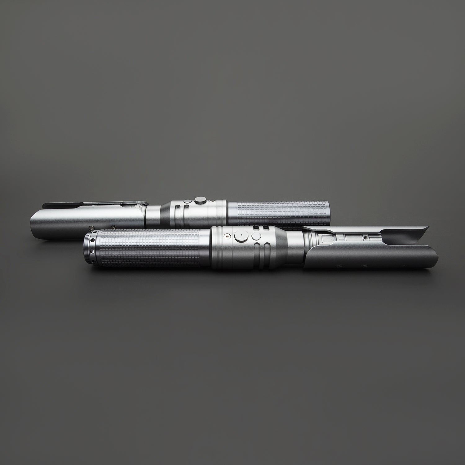 The Phoenix Staff is a saberstaff consisting of two separate sabers that can be connected using the included coupling piece, but can also be used separately. Each saber is relatively long with a finely ribbed black grip. A grip like this can be found on no other saber. The special ribbed pattern combined with the smooth, round shape of the saber handle makes this model incredibly comfortable to hold. The activation button is the same color as the handle, so it doesn’t stand out. This gives it a calm and realistic look! Additionally, the charging port is discreetly hidden and the saber is charged via the USB-C port above the speaker on the inside of the saber. The top (emitter) of The Phoenix features two characteristic elongated plates. The Phoenix Staff is perfect for spinning as a saberstaff or for stylish dual wielding.