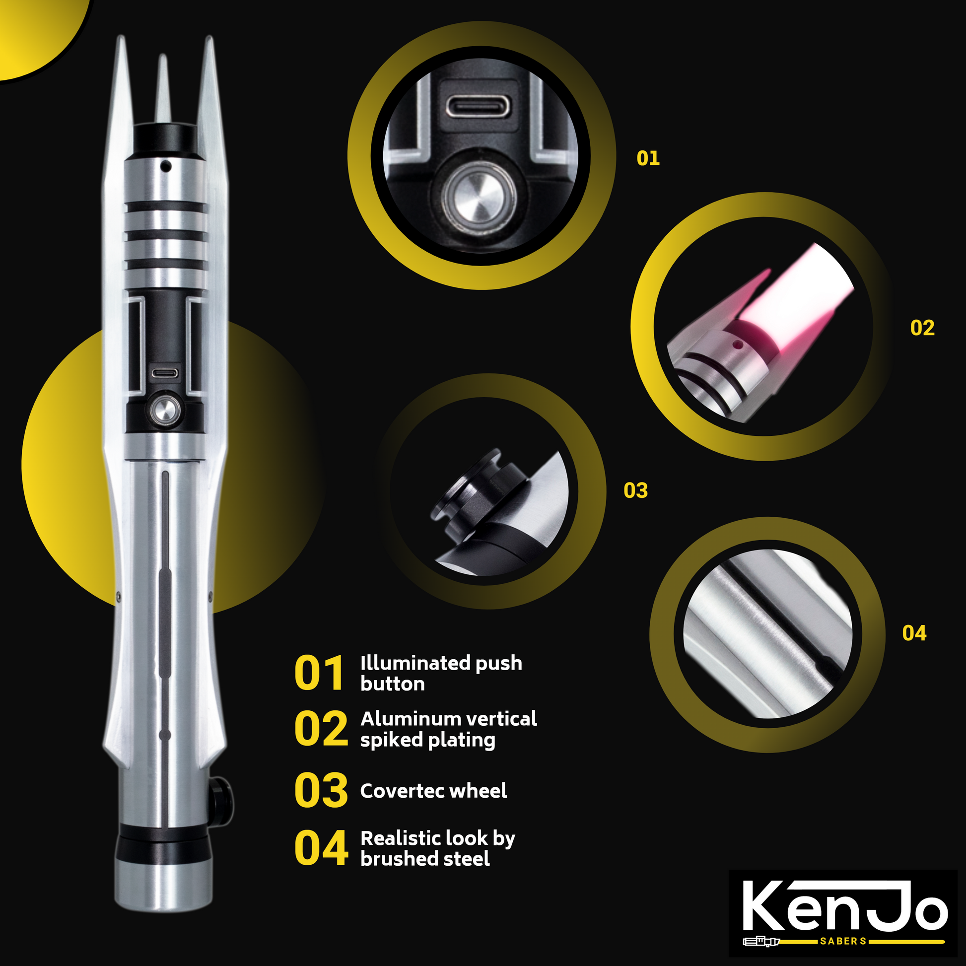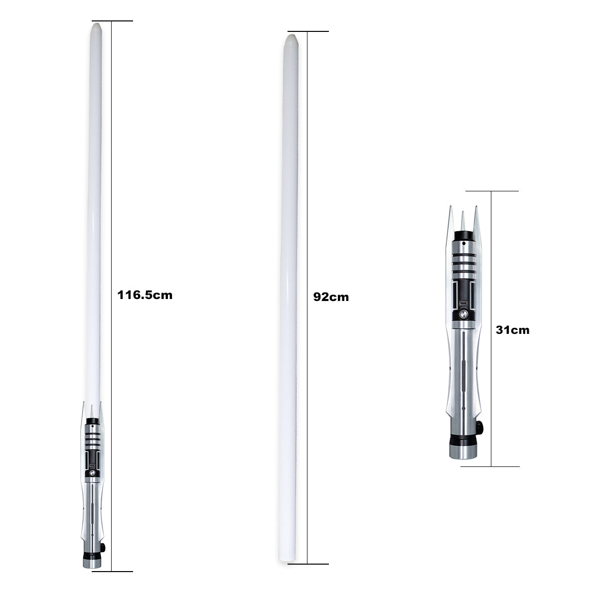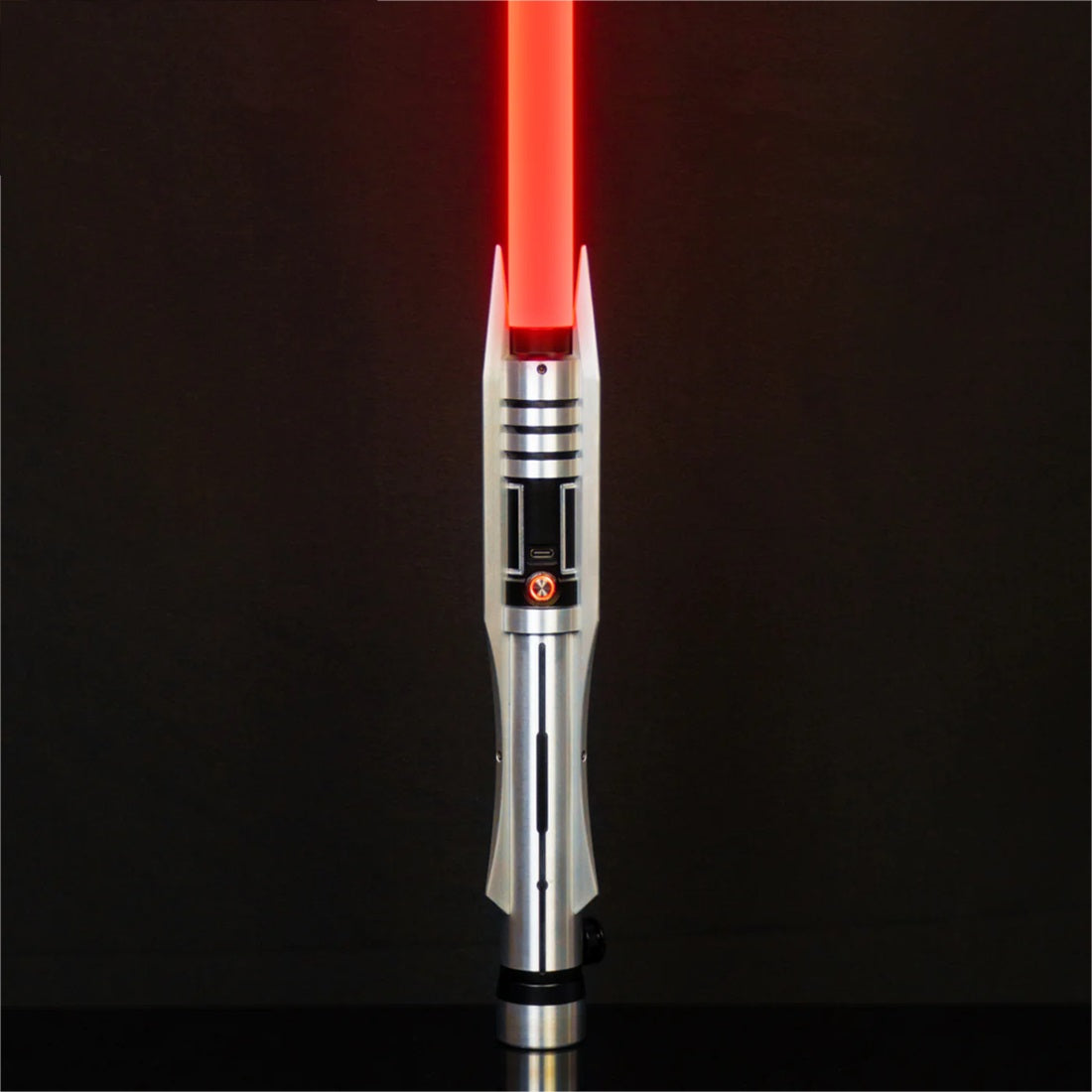 The handle of the Reaper is made from solid brushed aluminum, featuring horizontally mounted spikes. The black accents against the brushed aluminum give this lightsaber a realistic and high-quality appearance. The lightsaber fits smoothly in the hand and has excellent weight balance.