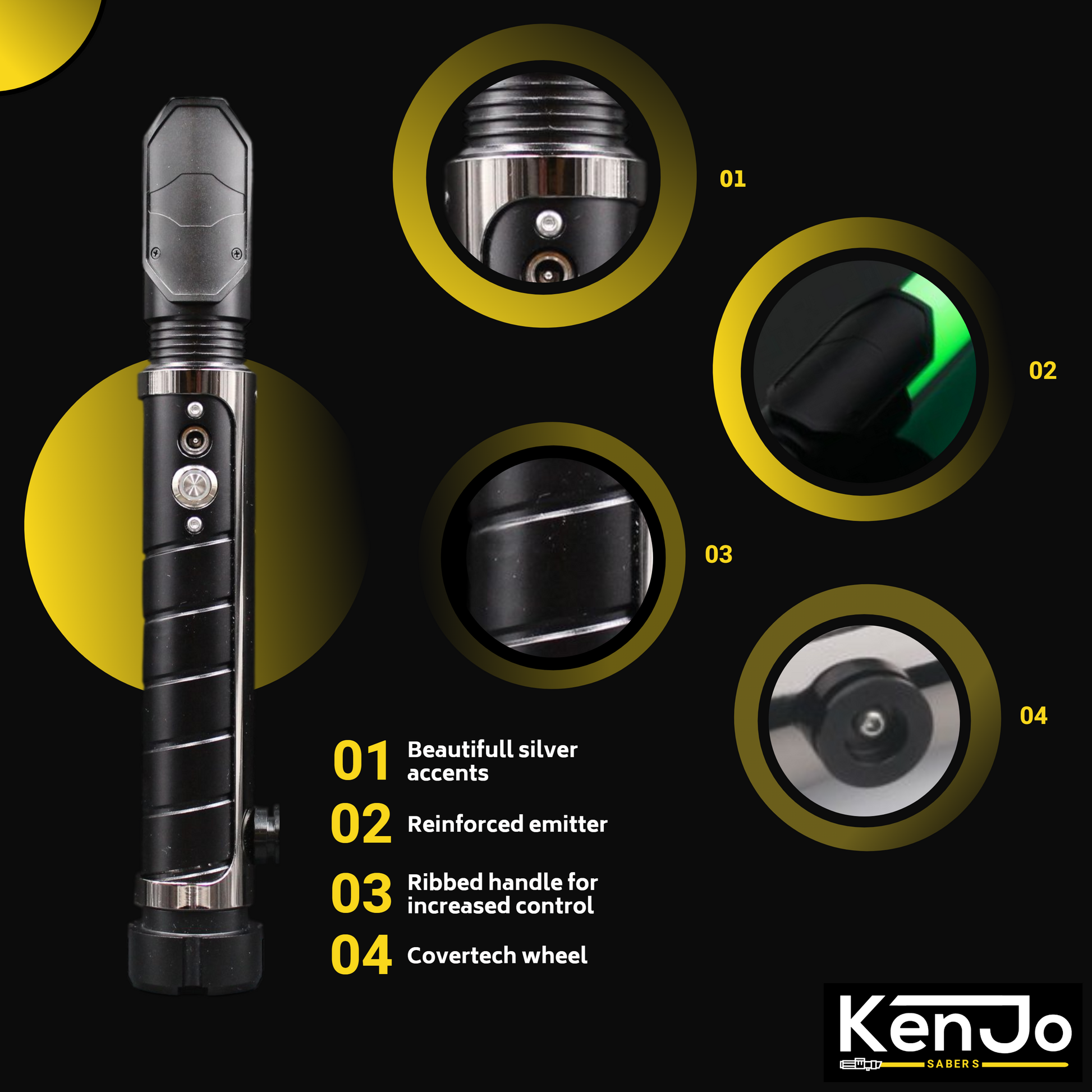 The upper side of this saber is equipped with a cool shield that gives the Resolute that little extra edge. The lower side of the Resolute features a sturdy round pommel with grooves, allowing you to stand the saber upright easily and securely.
