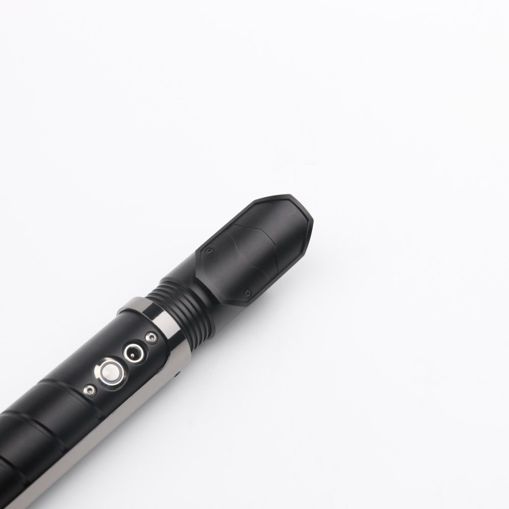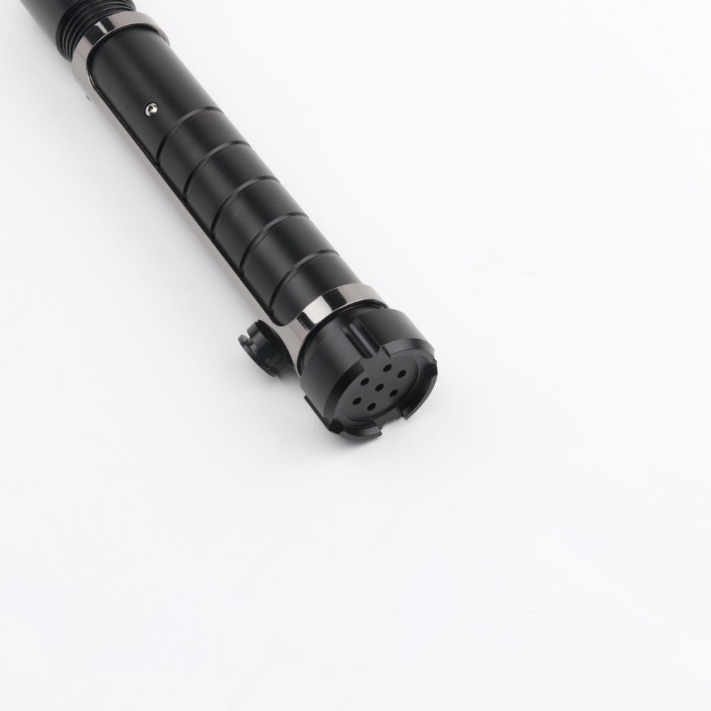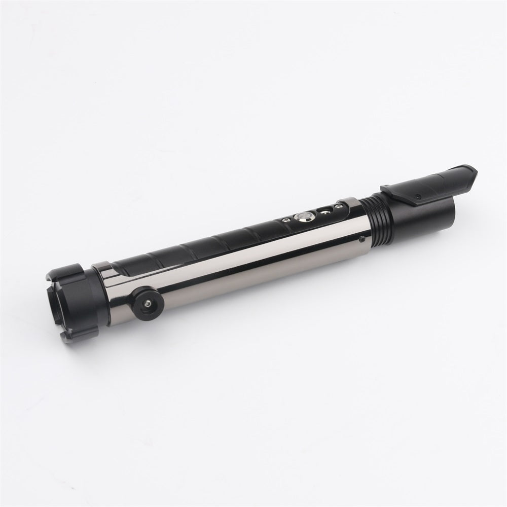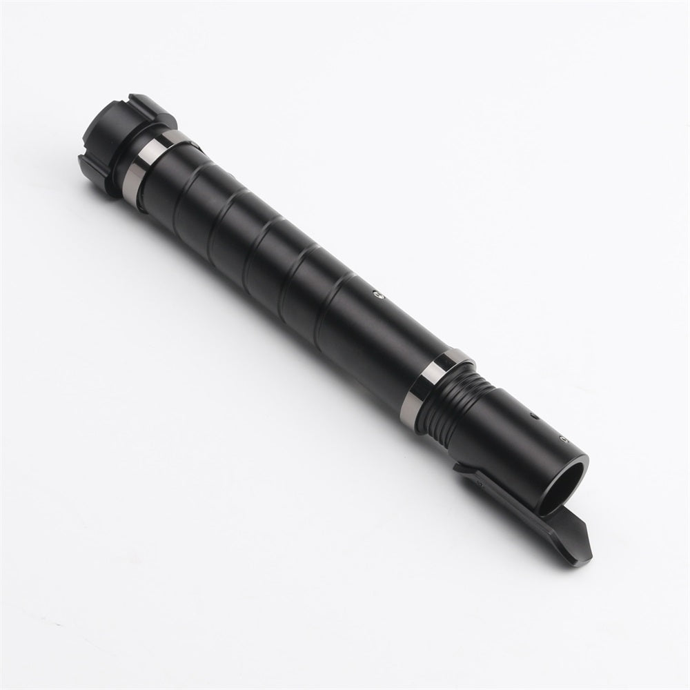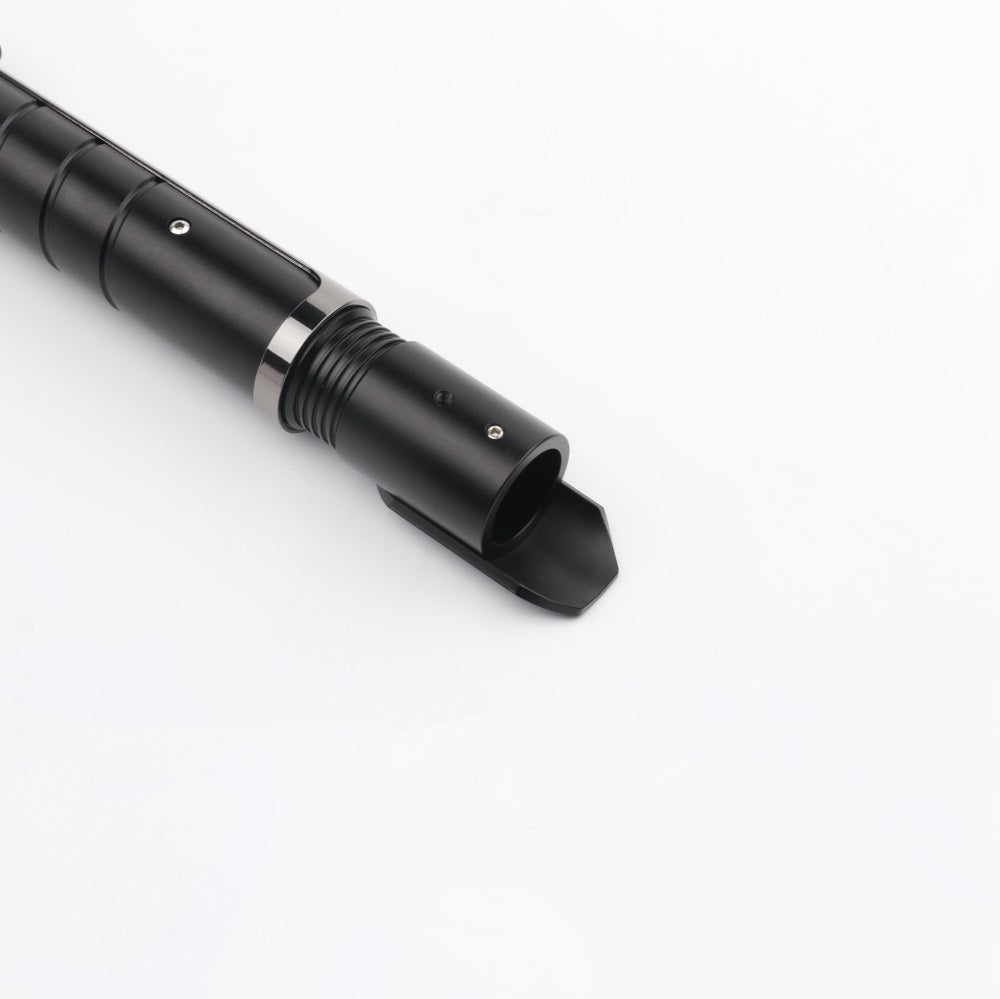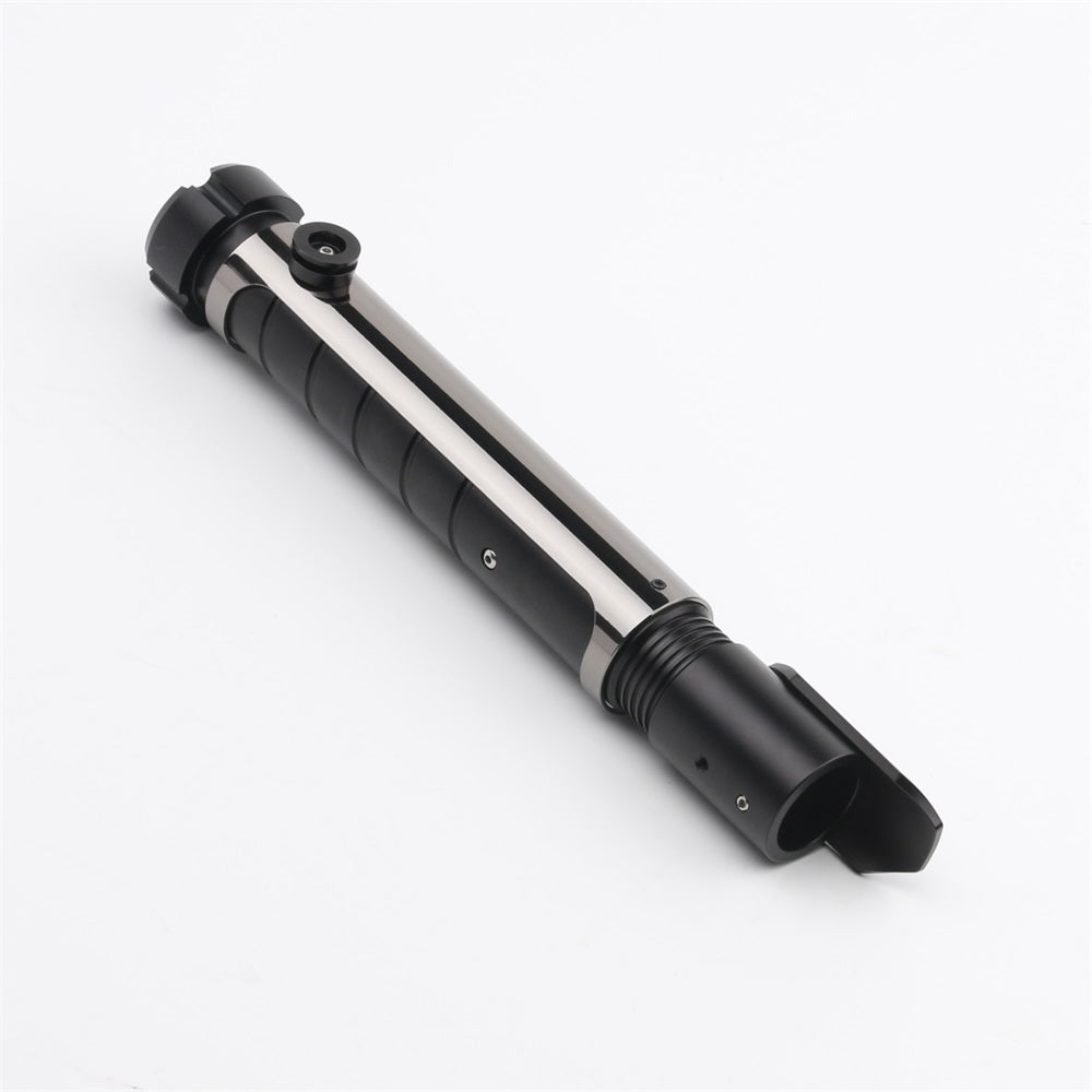 The handle of the Resolute lightsaber is made of a matte black-colored aluminum alloy with a continuous groove for extra grip. The saber features a dark-colored chrome hilt sleeve, giving the Resolute a tough and premium look. The sleeve also includes a built-in belt clip connector, making it easy to attach this Prime Spheres Saber to your belt in combination with the Prime Spheres Sabers Belt Clip (not included and sold separately). Ideal for completing a cosplay outfit or for carrying the saber around.