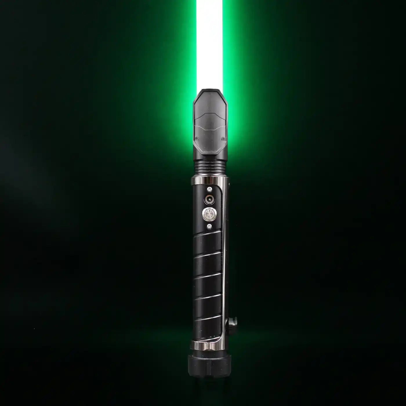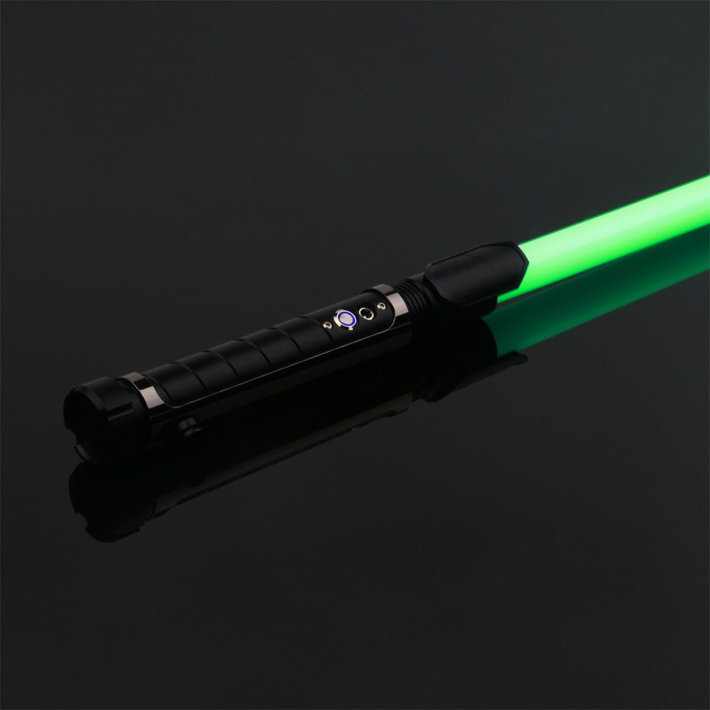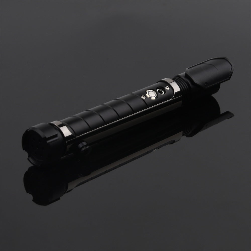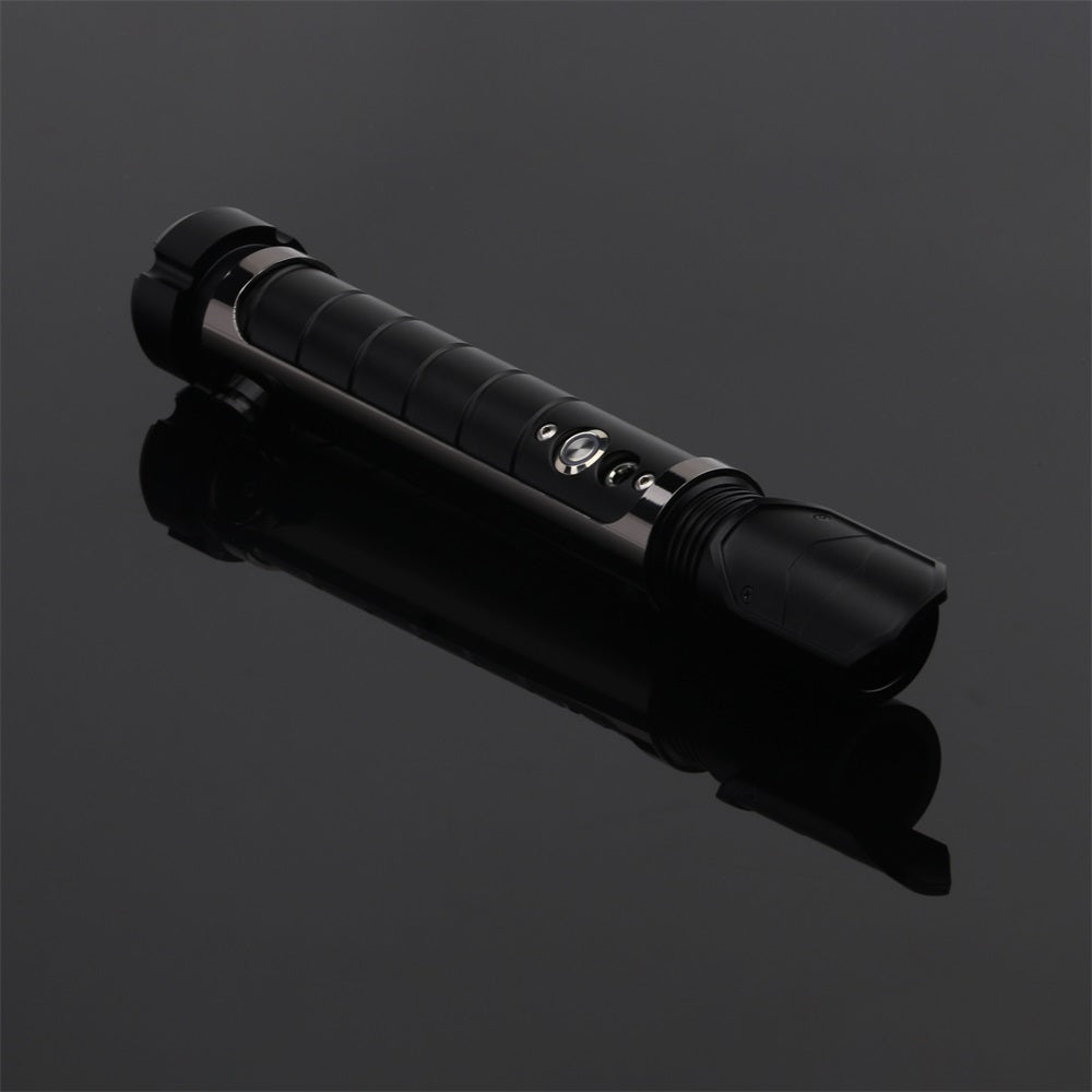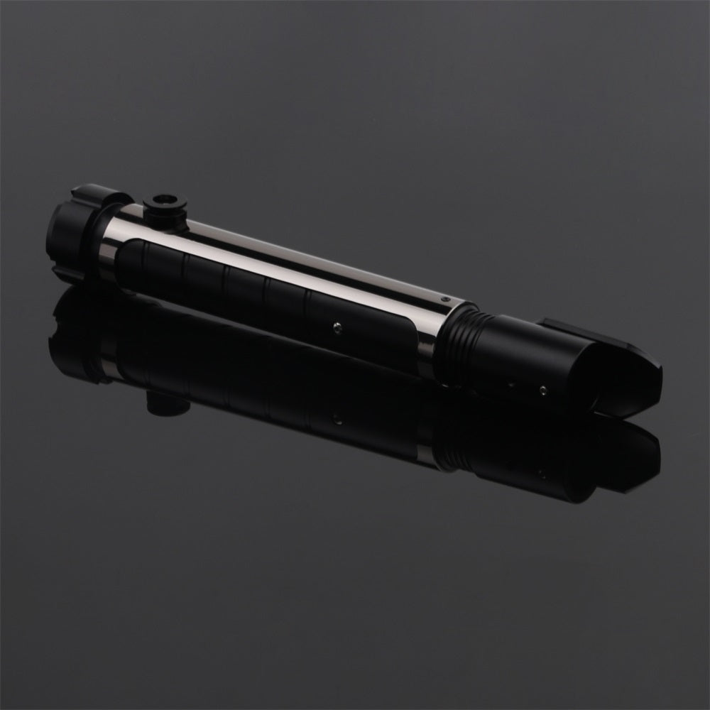 The handle of the Resolute lightsaber is made of a matte black-colored aluminum alloy with a continuous groove for extra grip. The saber features a dark-colored chrome hilt sleeve, giving the Resolute a tough and premium look. The sleeve also includes a built-in belt clip connector, making it easy to attach this Prime Spheres Saber to your belt in combination with the Prime Spheres Sabers Belt Clip (not included and sold separately). Ideal for completing a cosplay outfit or for carrying the saber around.