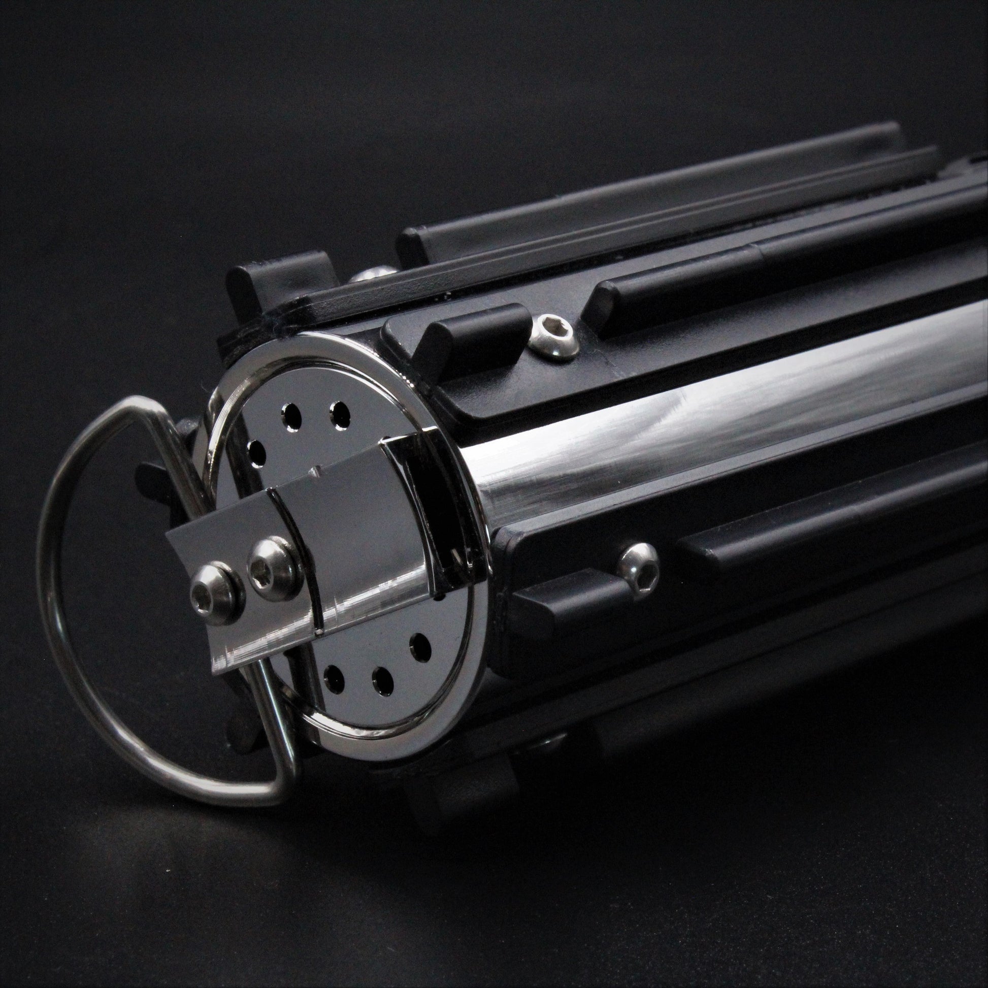 The bottom (pommel) is equipped with a D-Clip, allowing you to attach the saber to your belt. For this, you’ll need the Prime Spheres Sabers Belt Clip.