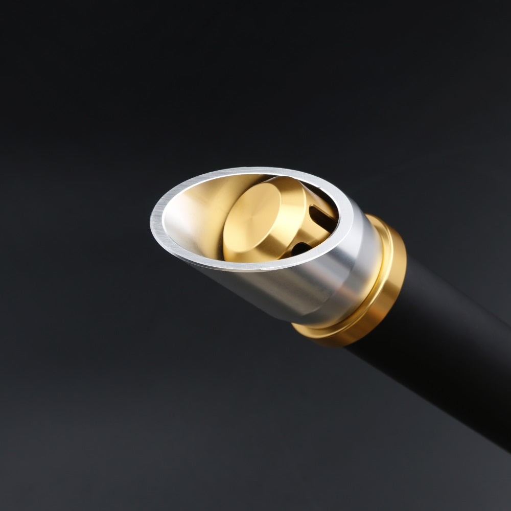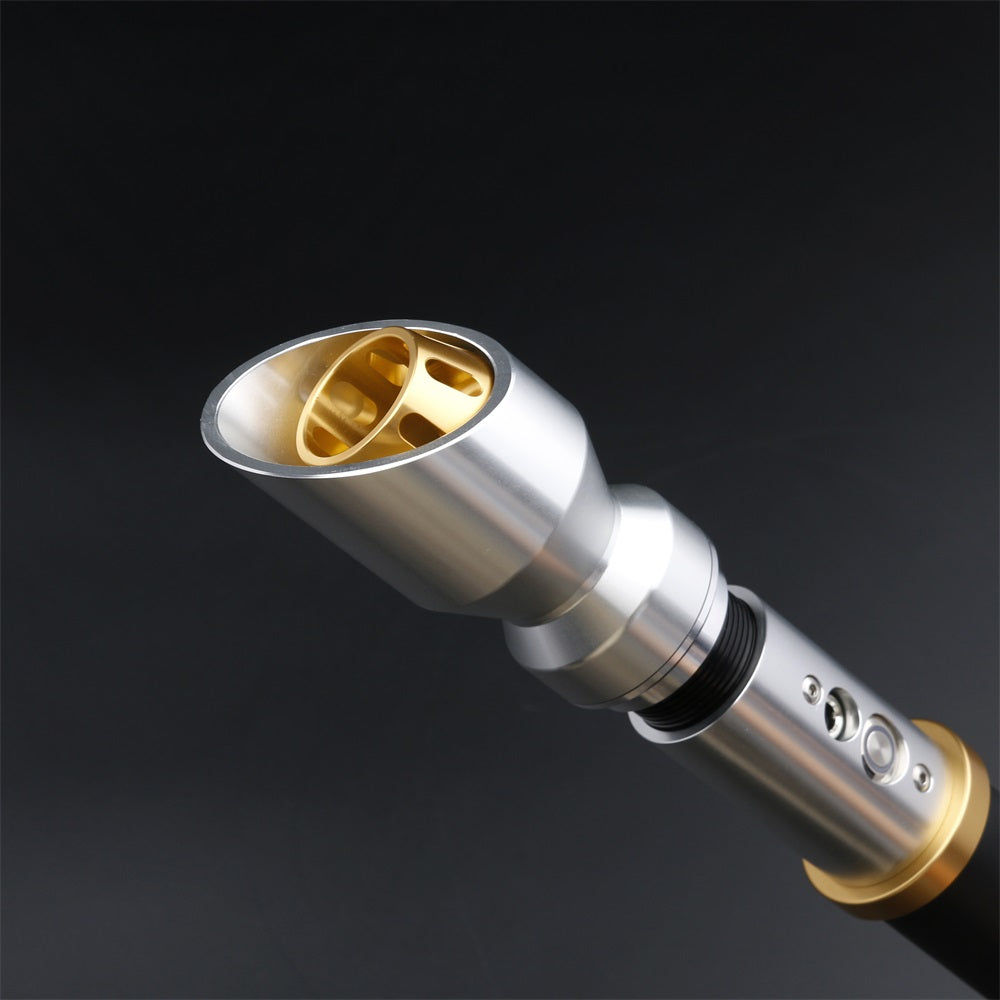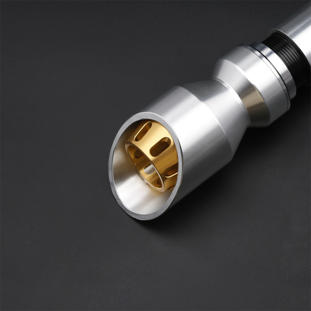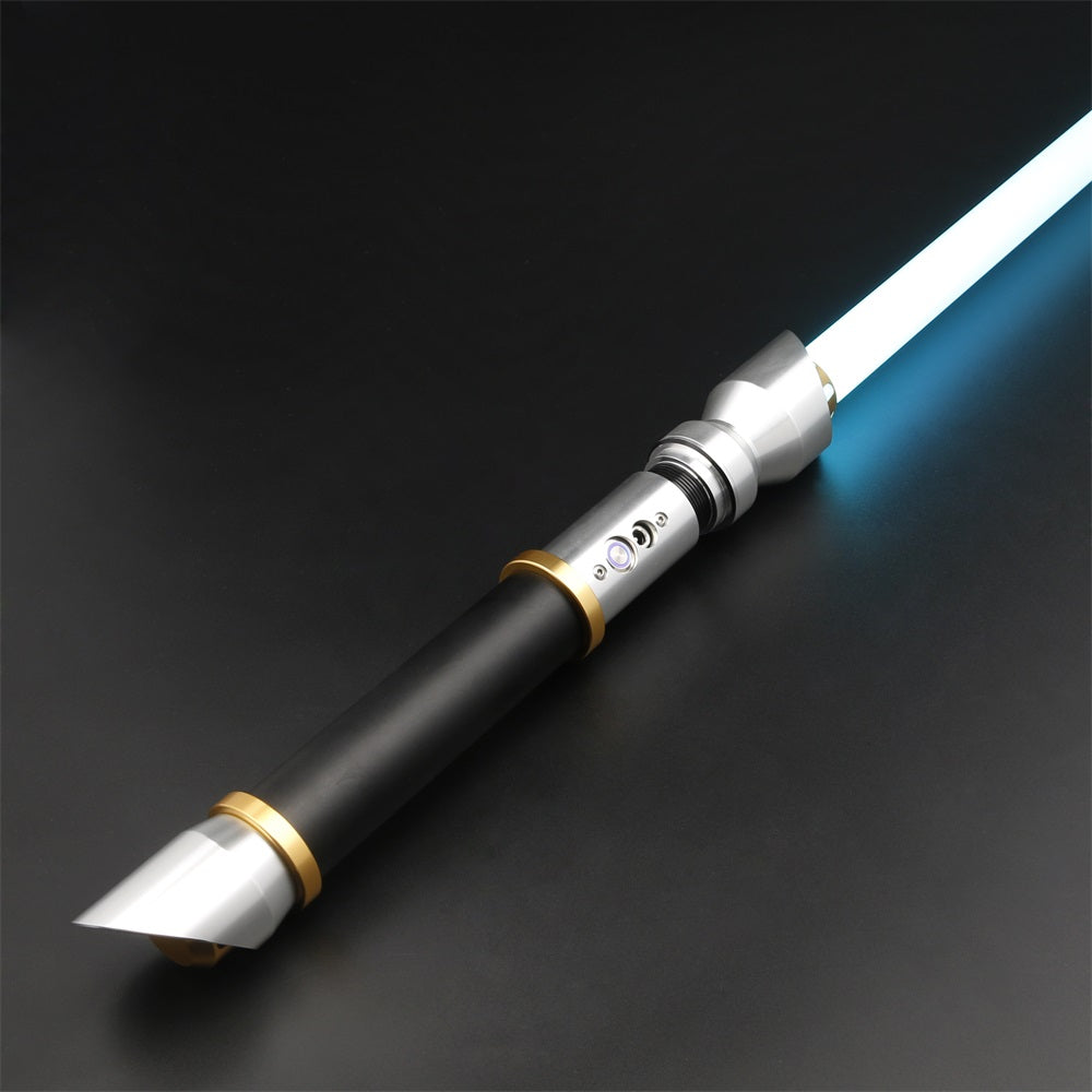The sleek black grip, accented with gold details on both ends, gives the saber a clean, elegant appearance. Both the emitter and the pommel feature angled cuts with golden interiors, adding a striking contrast and enhancing its sophisticated design.