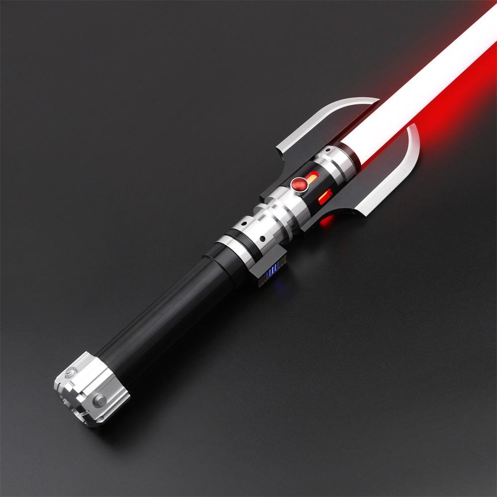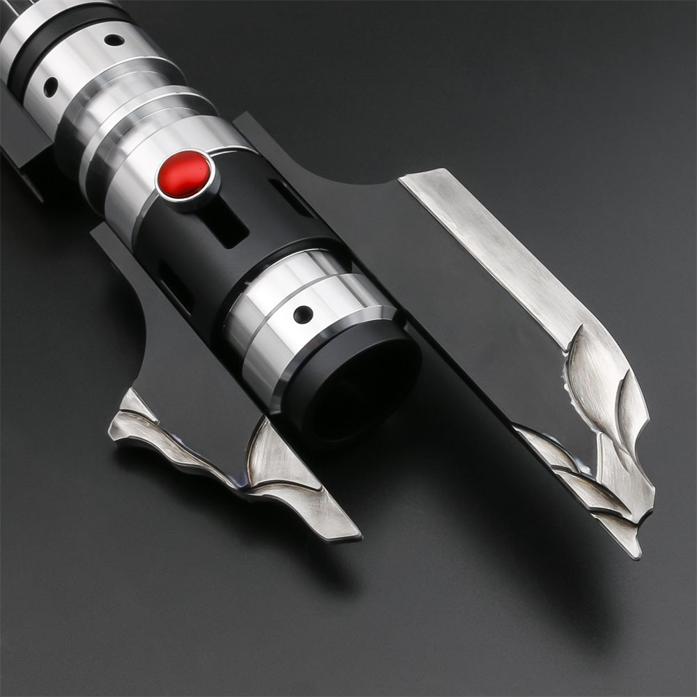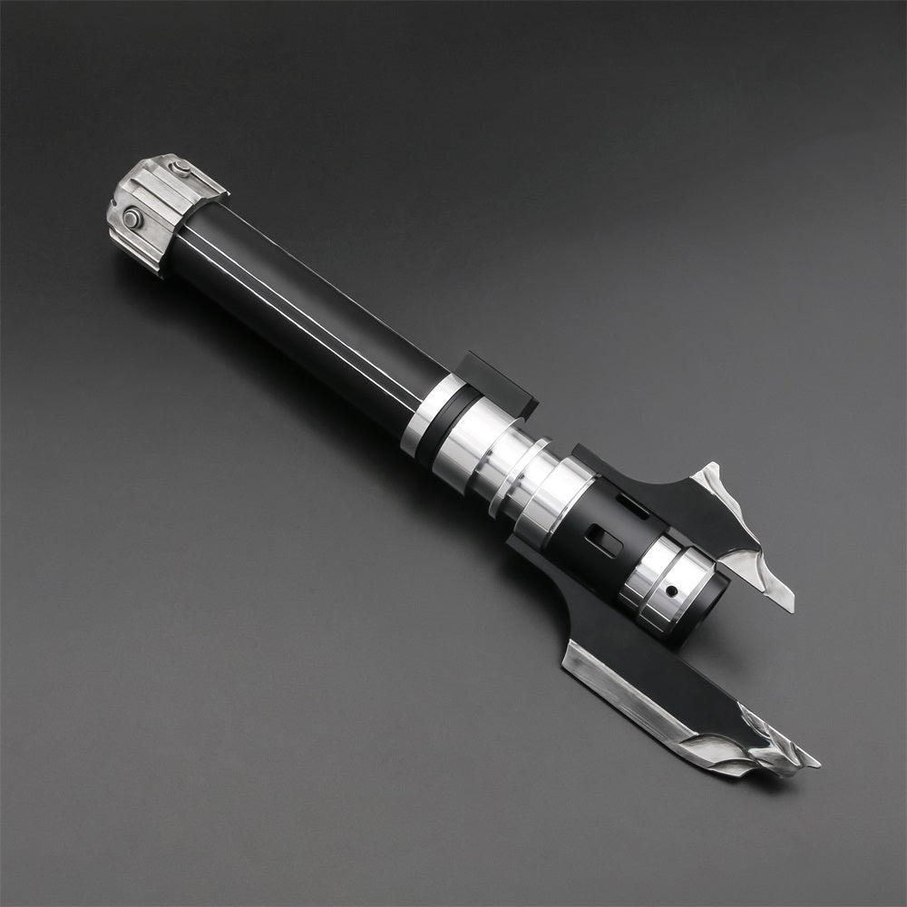 Description: Vindicators Edge is an impressive saber with a very dark appearance. The design is sleek and advanced. The first thing that stands out is the black and silver plates protruding from the top, giving it a ruthless and powerful look. These feature realistic damage, which extends throughout the rest of the design, giving it a weathered or ‘battle-damaged’ look. Below that, there are several light-transmitting holes. The lightsaber’s handle is made of smooth, black polished metal, providing a comfortable grip. The design of the lightsaber is sleek and advanced, with many sharp edges and angles, giving it a ruthless and powerful appearance.