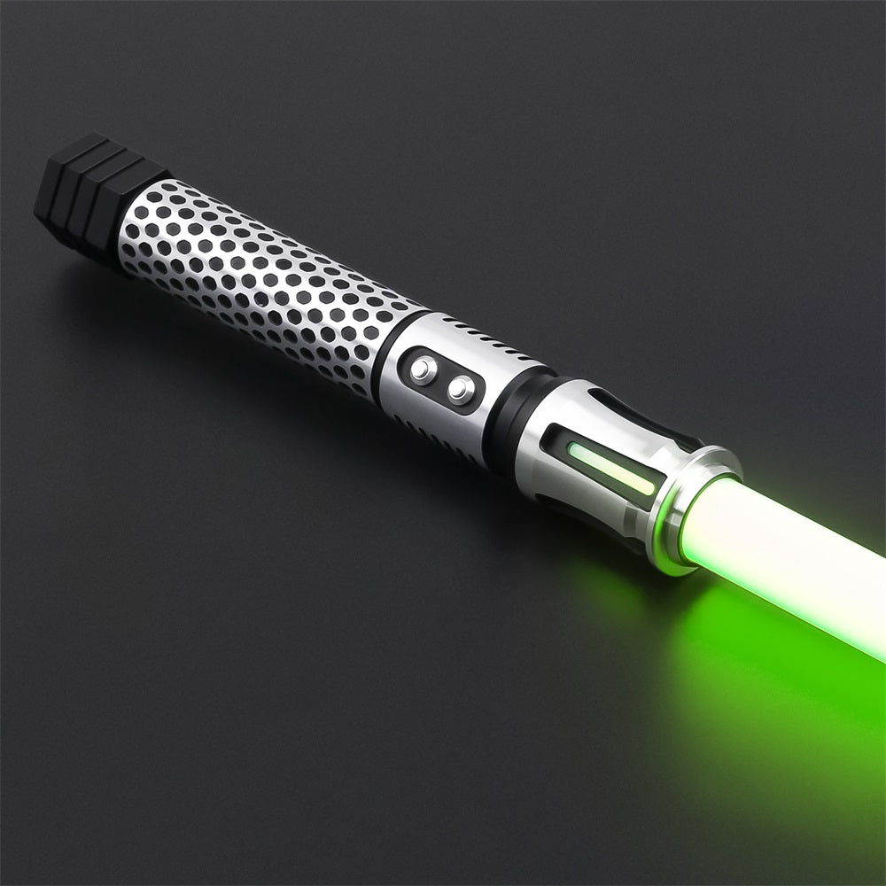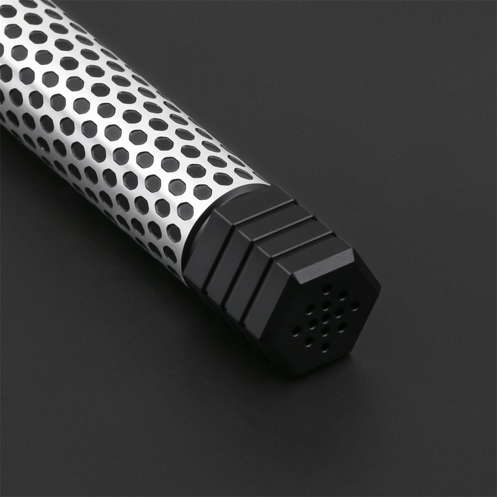Description: The Void is a predominantly black saber, accented with numerous silver details. The first thing that catches the eye is the symmetrical pattern of holes on the hilt, adding a distinctive texture and style.